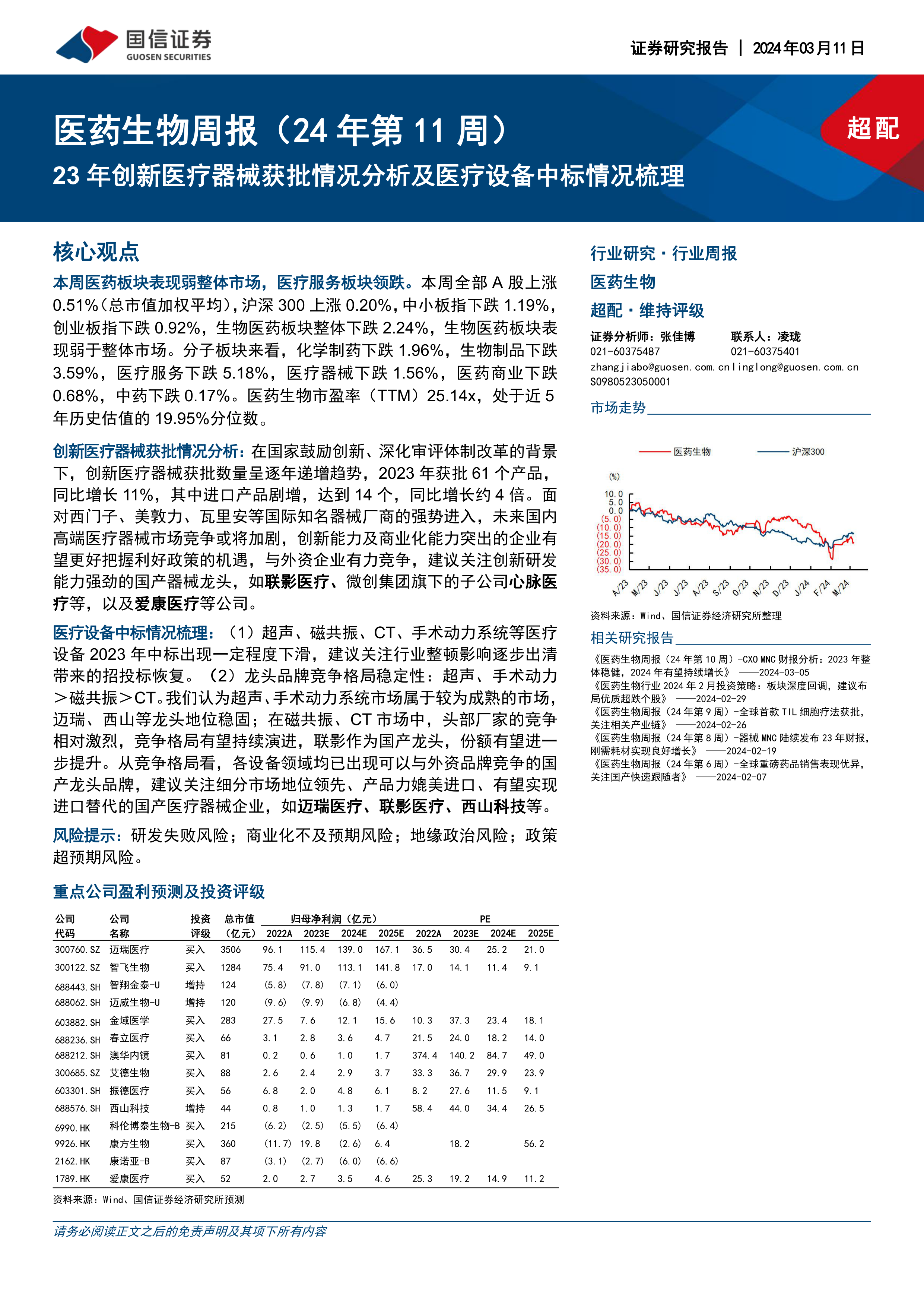 医药生物周报(24年第11周):23年创新医疗器械获批情况分析及医疗设备中标情况梳理