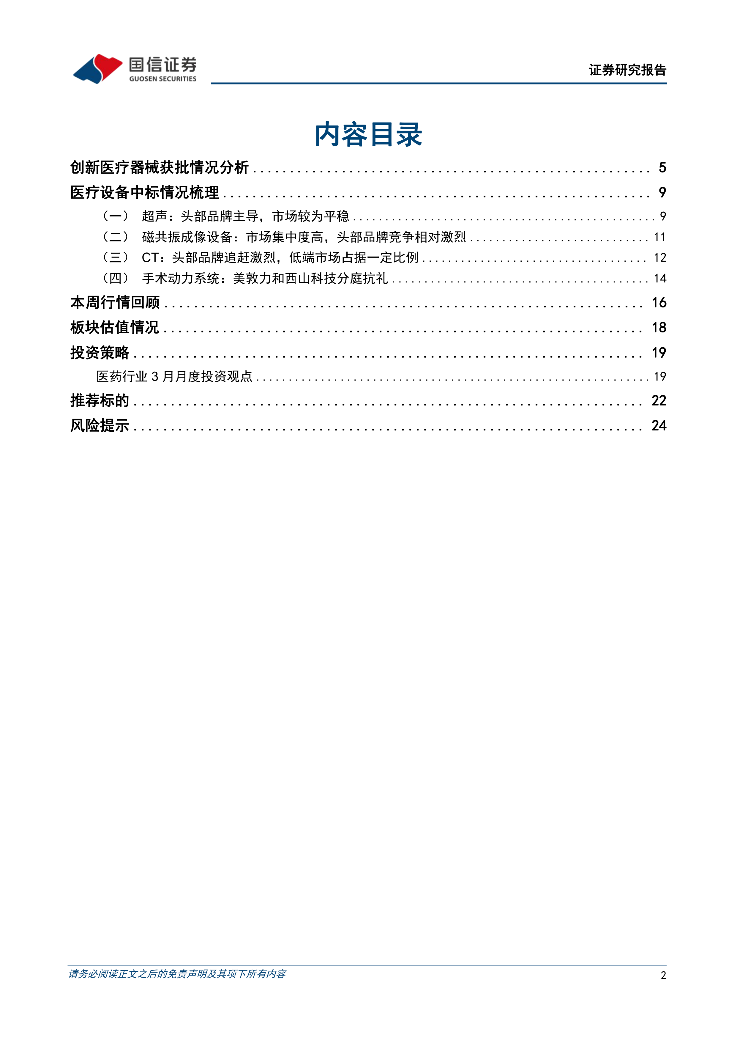 国信医药观点: 建议关注行业整顿影响逐步出清带来的招投标恢复,并关注细分市场地位领先、产品力媲美进口、有望实现进口替代的国产医疗器械企业,如迈瑞医疗、联影医疗、西山科技等。