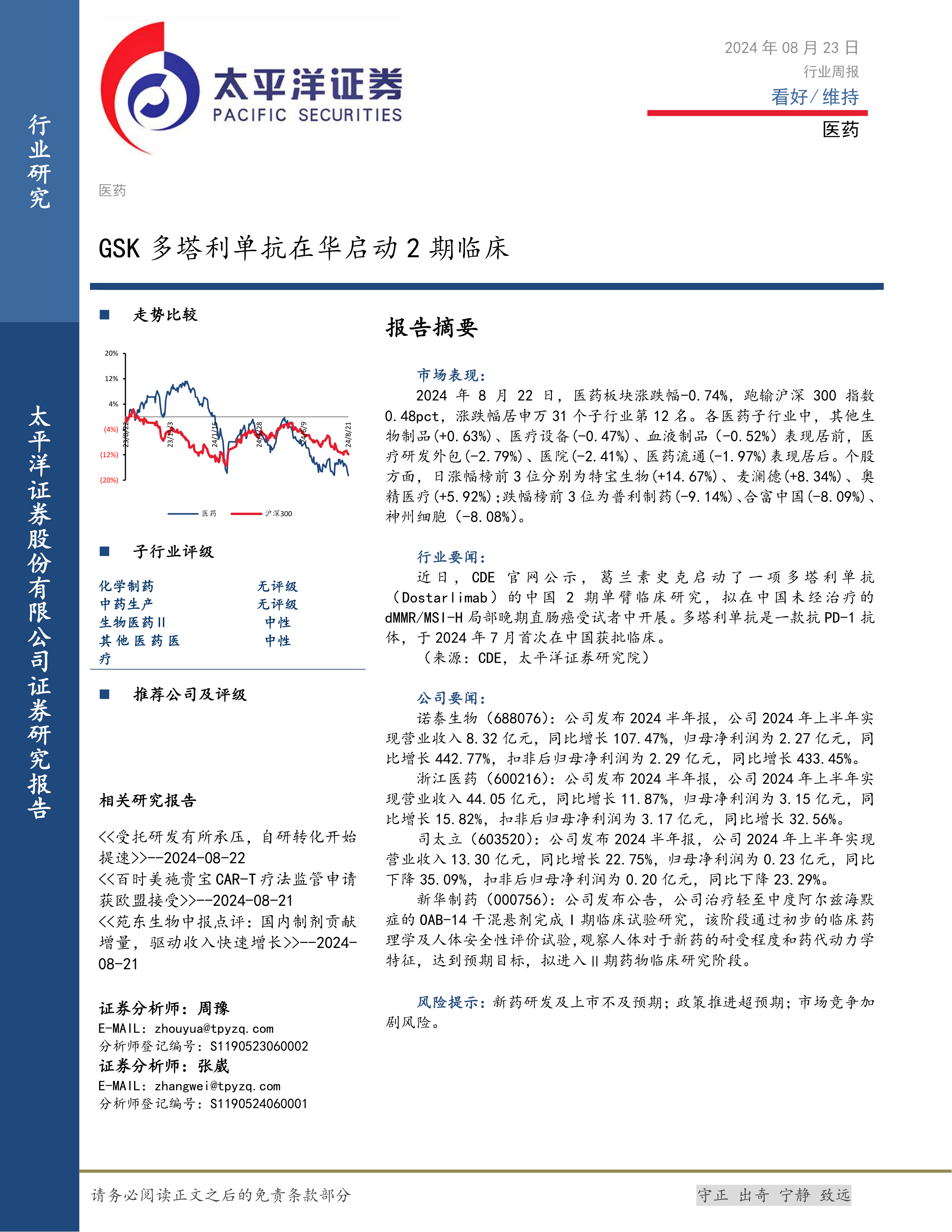本报告的核心观点是:医药板块整体表现略逊于大盘,但个别公司表现亮眼。GSK多塔利单抗在中国启动二期临床试验,为行业发展带来积极信号。部分公司半年报显示业绩增长强劲,但也存在一些公司业绩下滑的情况。整体而言,医药行业发展存在机遇与挑战并存的局面。