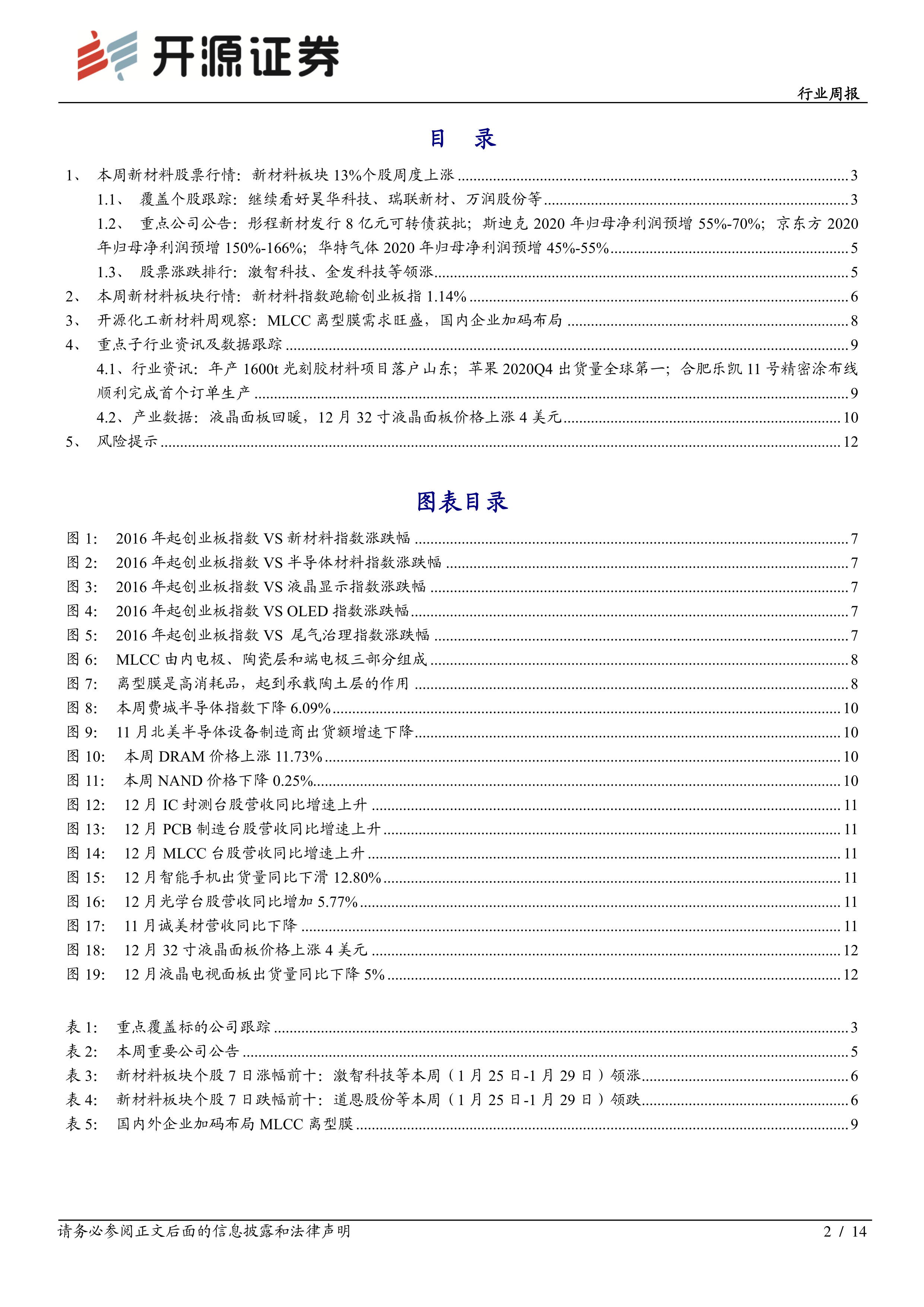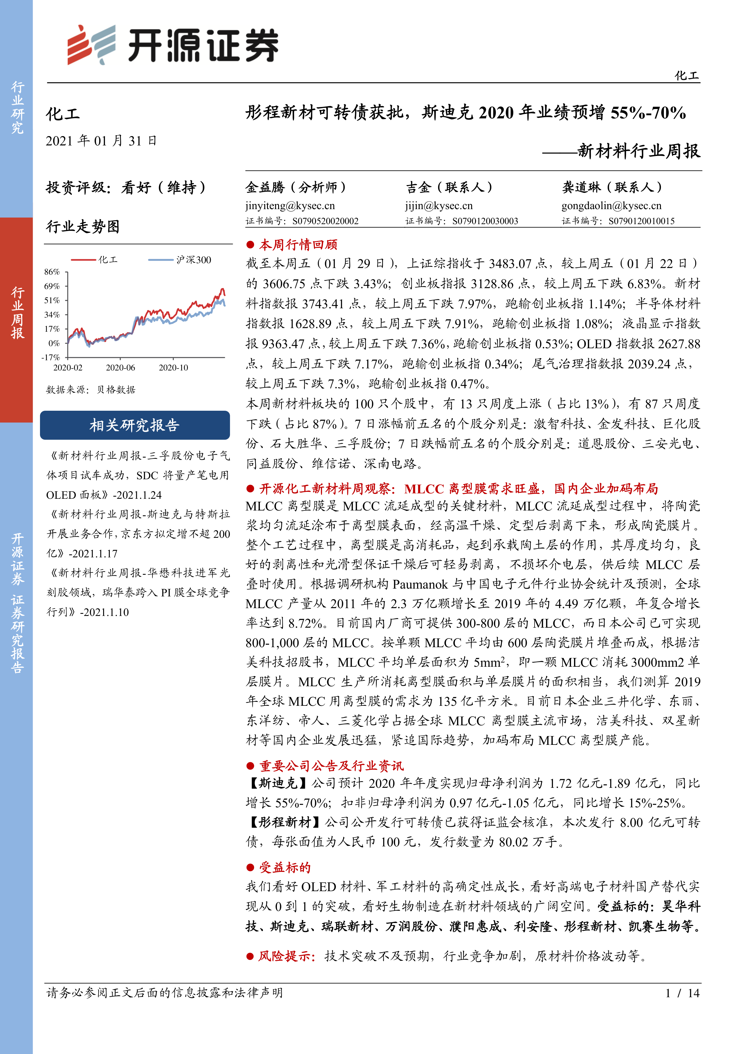 本报告的核心观点是:新材料行业本周整体表现疲软,跑输创业板指,但部分细分领域展现出积极信号。具体而言,MLCC离型膜需求旺盛,国内企业加码布局;光刻胶、OLED等领域也出现利好消息。同时,部分公司业绩预增显著,例如斯迪克2020年归母净利润预增55%-70%,彤程新材发行8亿元可转债获批。然而,行业整体面临技术突破不及预期、行业竞争加剧以及原材料价格波动等风险。