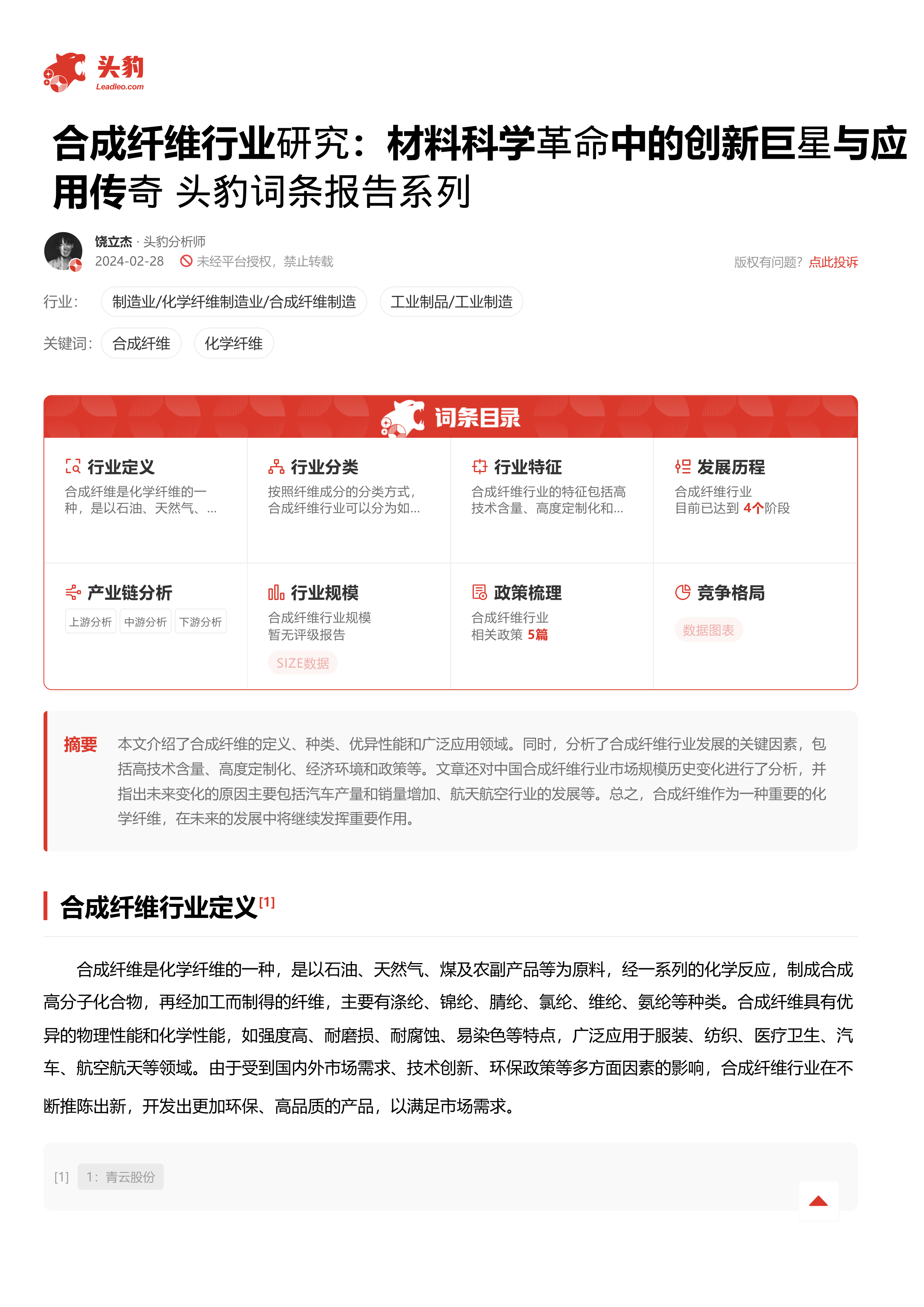 本报告基于Leadleo.com发布的《合成纤维行业研究:材料科学革命中的创新巨星与应用传奇》头豹词条报告,运用数据和统计分析方法,对中国合成纤维行业市场规模、产业链、竞争格局以及未来发展趋势进行深入剖析。报告核心观点如下: