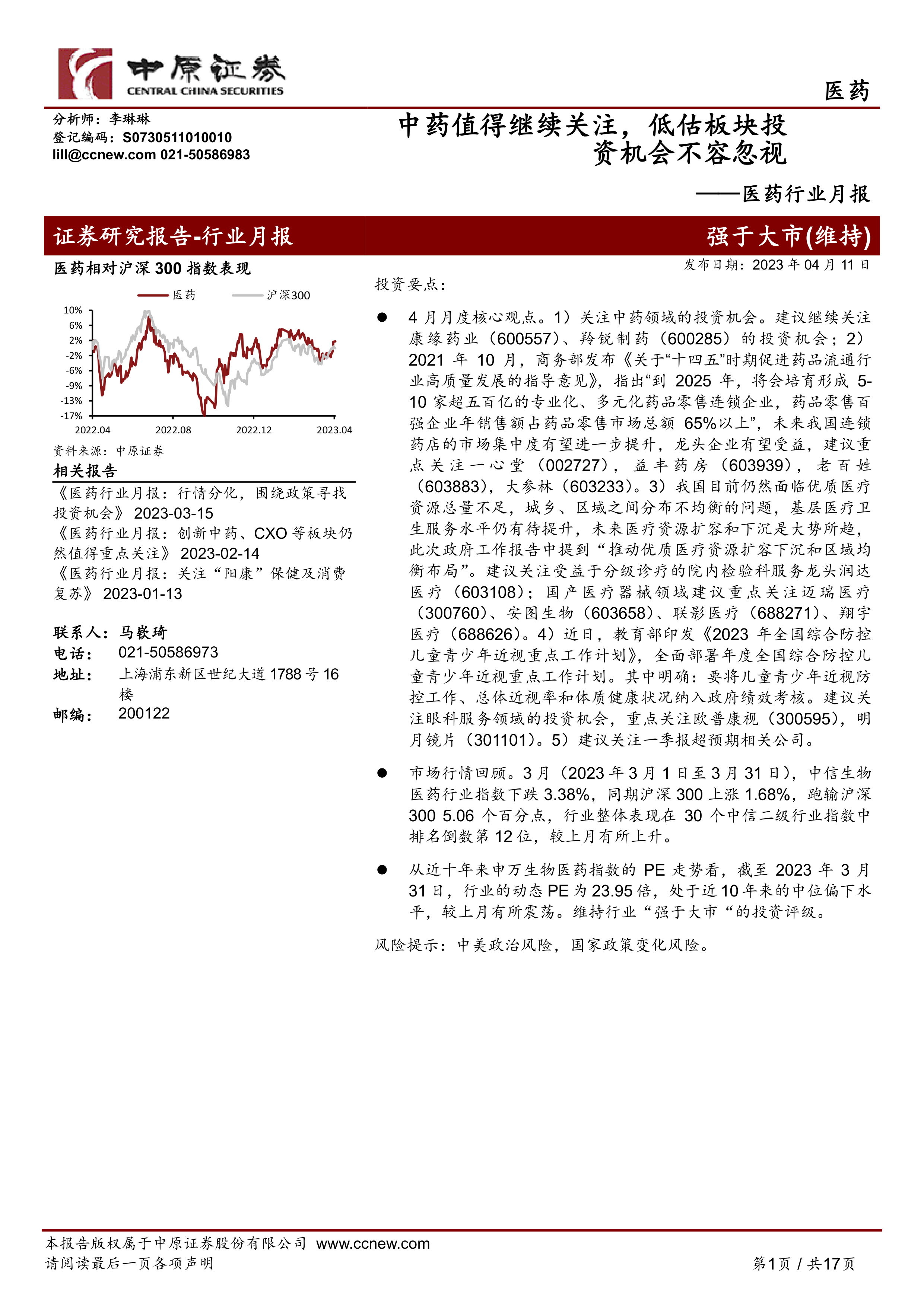4月月度核心观点。1)关注中药领域的投资机会。建议继续关注康缘药业(600557)、羚锐制药(600285)的投资机会;2)2021年10月,商务部发布《关于“十四五”时期促进药品流通行业高质量发展的指导意见》,指出“到2025年,将会培育形成5-10家超五百亿的专业化、多元化药品零售连锁企业,药品零售百强企业年销售额占药品零售市场总额65%以上”,未来我国连锁药店的市场集中度有望进一步提升,龙头企业有望受益,建议重点关注一心堂(002727),益丰药房(603939),老百姓(603883),大参林(603233)。3)我国目前仍然面临优质医疗资源总量不足,城乡、区域之间分布不均衡的问题,基层医疗卫生服务水平仍有待提升,未来医疗资源扩容和下沉是大势所趋,此次政府工作报告中提到“推动优质医疗资源扩容下沉和区域均衡布局”。建议关注受益于分级诊疗的院内检验科服务龙头润达医疗(603108);国产医疗器械领域建议重点关注迈瑞医疗(300760)、安图生物(603658)、联影医疗(688271)、翔宇医疗(688626)。4)近日,教育部印发《2023年全国综合防控儿童青少年近视重点工作计划》,全面部署年度全国综合防控儿童青少年近视重点工作计划。其中明确:要将儿童青少年近视防控工作、总体近视率和体质健康状况纳入政府绩效考核。建议关注眼科服务领域的投资机会,重点关注欧普康视(300595),明月镜片(301101)。5)建议关注一季报超预期相关公司。