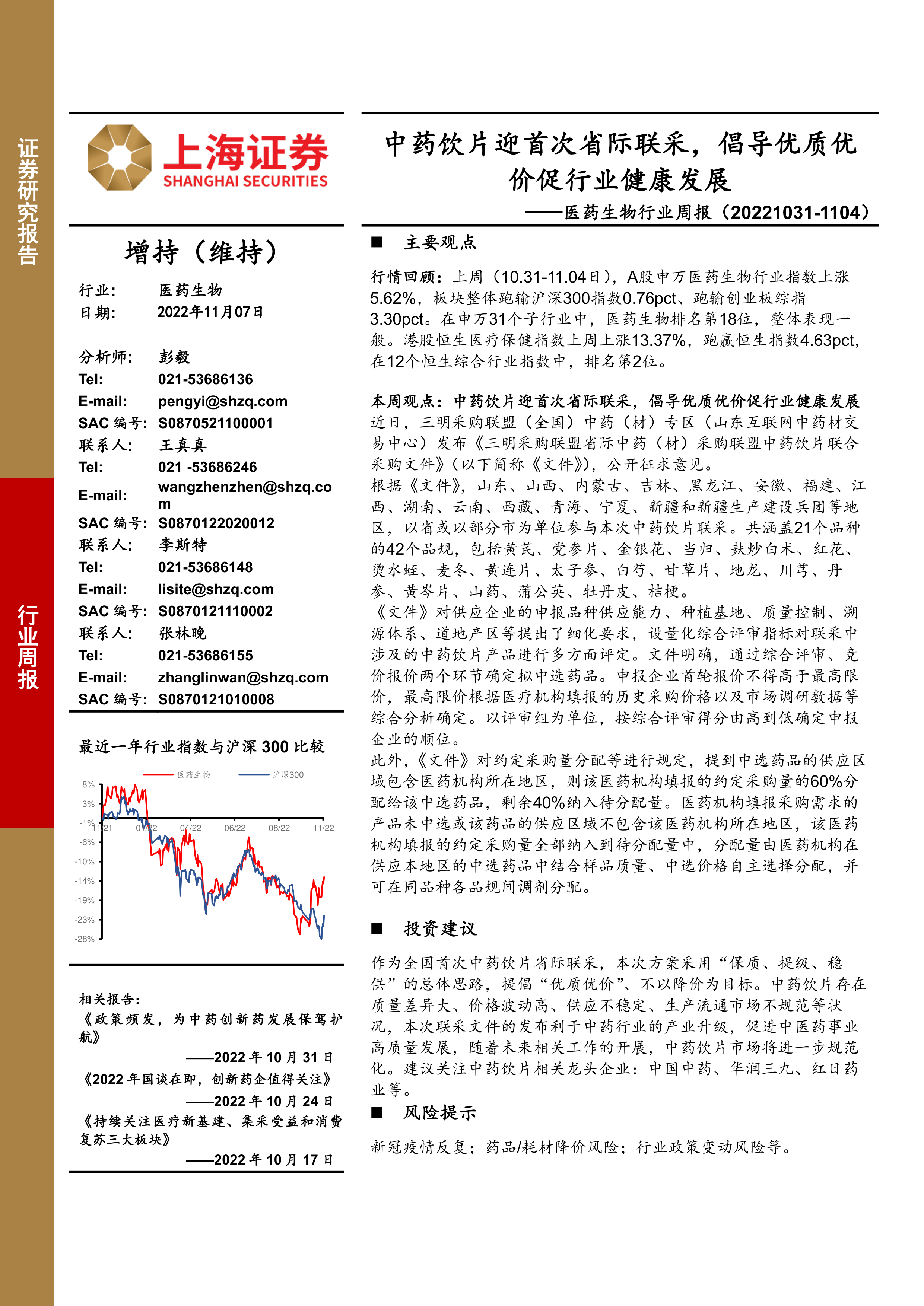 本报告首先分析了中药饮片首次省际联采对行业发展的影响,指出其旨在规范市场,促进产业升级,而非单纯压价。 其次,报告详细回顾了上周医药生物行业市场表现,并对部分个股进行了分析。 最后,报告更新了行业核心数据库,包括疫情数据、一致性评价信息、原料药价格、集中采购信息、公司融资信息以及重要公告信息等。 总体而言,报告内容全面,数据翔实,为投资者提供了对医药生物行业现状和未来发展趋势的深入分析。 报告建议关注中药饮片相关龙头企业,例如中国中药、华润三九、红日药业等。 但同时也提示了新冠疫情反复、药品/耗材降价风险、行业政策变动风险等潜在风险。