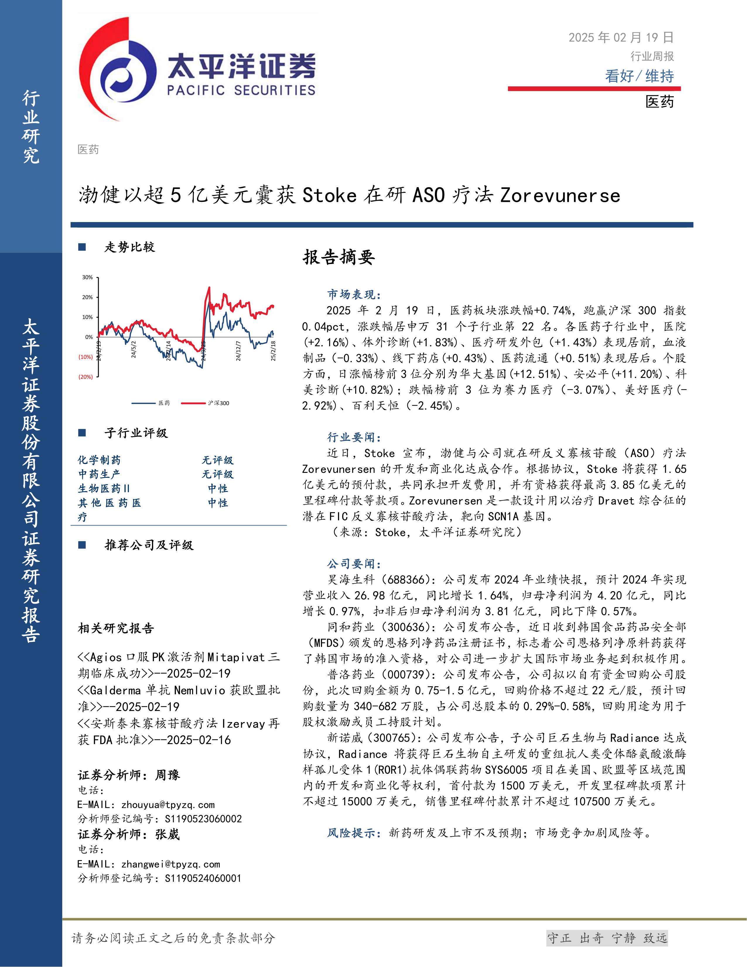 本报告的核心观点是:2025年2月19日,医药板块整体表现略好于大盘,部分子行业表现突出,个股涨跌分化明显。渤健斥资超5亿美元收购Stoke公司在研ASO疗法Zorevunersen,凸显了生物医药领域投资的活跃。同时,报告还对部分上市公司业绩及相关事件进行了简要分析。