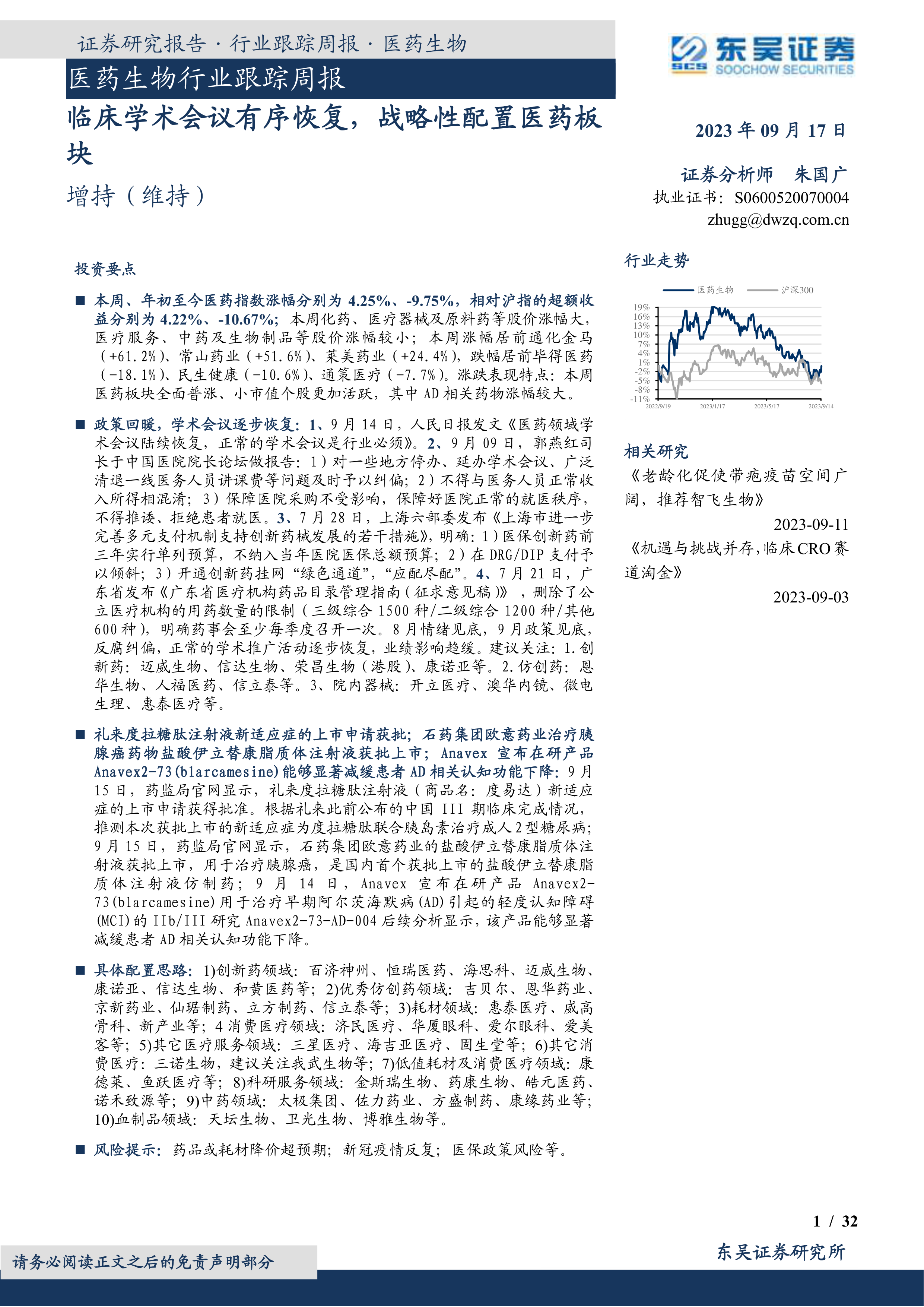 政策回暖,学术会议逐步恢复:1、9月14日,人民日报发文《医药领域学术会议陆续恢复,正常的学术会议是行业必须》。2、9月09日,郭燕红司长于中国医院院长论坛做报告:1)对一些地方停办、延办学术会议、广泛清退一线医务人员讲课费等问题及时予以纠偏;2)不得与医务人员正常收入所得相混淆;3)保障医院采购不受影响,保障好医院正常的就医秩序,不得推诿、拒绝患者就医。3、7月28日,上海六部委发布《上海市进一步完善多元支付机制支持创新药械发展的若干措施》,明确:1)医保创新药前三年实行单列预算,不纳入当年医院医保总额预算;2)在DRG/DIP支付予以倾斜;3)开通创新药挂网“绿色通道”,“应配尽配”。4、7月21日,广东省发布《广东省医疗机构药品目录管理指南(征求意见稿)》,删除了公立医疗机构的用药数量的限制(三级综合1500种/二级综合1200种/其他600种),明确药事会至少每季度召开一次。8月情绪见底,9月政策见底,反腐纠偏,正常的学术推广活动逐步恢复,业绩影响趋缓。建议关注:1.创新药:迈威生物、信达生物、荣昌生物(港股)、康诺亚等。2.仿创药:恩华生物、人福医药、信立泰等。3、院内器械:开立医疗、澳华内镜、微电生理、惠泰医疗等。