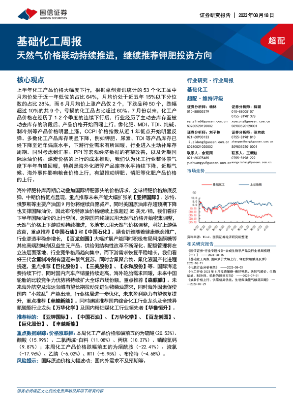 海外钾肥补库周期启动叠加国际钾肥寡头的价格诉求,全球钾肥价格触底反弹,中期价格低点显现,重点推荐未来产能大幅扩张的【亚钾国际】。沙特、俄罗斯等主要产油国9月份将继续自愿减产,同时美国原油库存超预期下降也支撑国际油价,因此布伦特原油价格继续上涨超过85美元/桶,我们看好下半年国际油价的上行空间,近期国内终端民用天然气价格开始密集调整,天然气价格上下游联动持续推进,多地市民用天然气价格调整,利好上游供应商,重点推荐【中国石油】和【中国石化】。膳食纤维随着健康概念推广,行业渗透率稳步增长,【百龙创园】大幅扩展产能同时积极布局阿洛酮糖等其他高端甜味剂及益生元产品。供给侧结构性改革不断深化、配额管理将在立法层面落地、行业竞争格局趋向集中,而下游需求恢复平稳增长,我们看好三代含氟制冷剂有望迎来景气复苏,同时含氟聚合物、氟化液国产化进程提速,重点推荐【巨化股份】、【三美股份】、【永和股份】等。国际海运费持续下行,同时国内汽车产销量持续走高,海外轮胎需求回暖,未来中国轮胎的比较竞争力优势将持续扩大全球市场份额,重点推荐【森麒麟】。未来海外航空及海运领域有望长期拉动先进生物柴油需求,同时海外因素促使国内“小散乱”产能出清,行业格局进一步优化,未来盈利能力有望恢复提升,重点推荐【卓越新能】。同时继续推荐国内综合化工行业龙头及全球异氰酸酯行业龙头【万华化学】及国内精细煤化工行业领先者【华鲁恒升】。