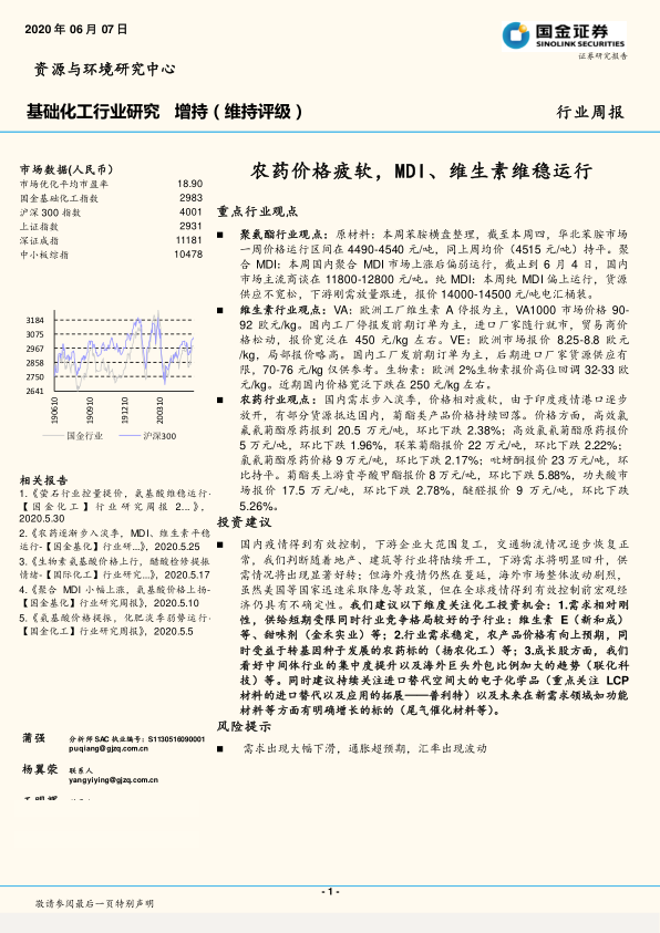 本报告的核心观点是:中国基础化工行业在2020年6月呈现出分化态势。农药行业受淡季影响价格疲软,而MDI和维生素行业则相对稳定。宏观经济方面,国内疫情得到有效控制,下游需求有望回升,但海外疫情仍存在不确定性。报告建议关注需求刚性、供给受限且竞争格局良好的子行业,以及进口替代空间大的电子化学品和在新需求领域有增长潜力的标的。