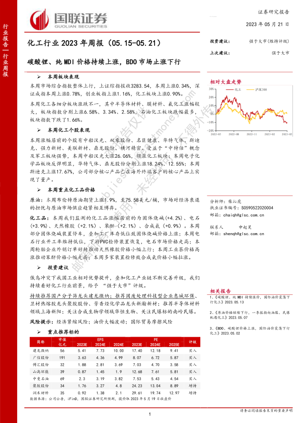 本报告对2023年5月15日至5月21日化工行业周报进行了数据分析和解读。本周化工板块整体表现强于大盘,但细分板块和个股表现分化明显。部分化工品价格上涨,部分下跌,价格波动较大。报告分析了市场行情、重点化工品价格、公司公告和行业新闻,并提出了几条主要的投资主线和建议,同时提示了投资者需要注意的风险。 我们维持对化工行业的“强于大市”评级,并建议投资者关注报告中推荐的具有国产替代优势、低估值或高成长属性的标的,但需密切关注市场风险。