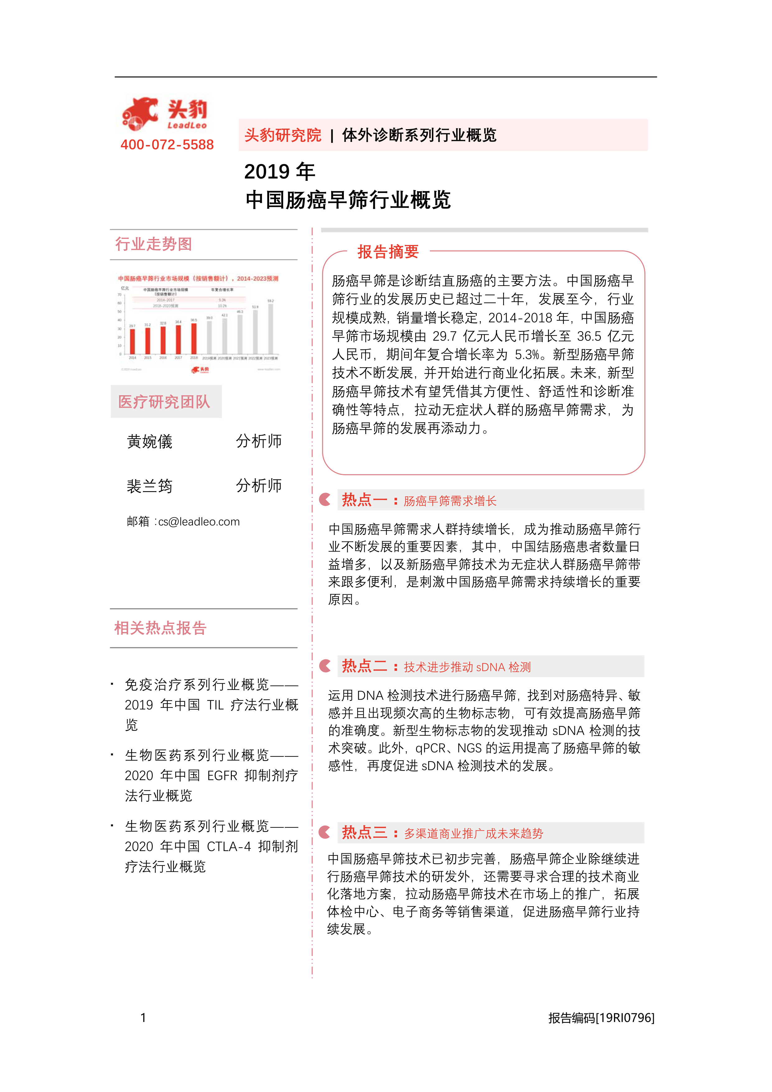 本报告基于头豹研究院发布的《2019年中国肠癌早筛行业概览》,利用统计数据和市场分析,探讨中国肠癌早筛行业的发展现状、驱动因素、制约因素以及未来发展趋势。报告核心观点如下: