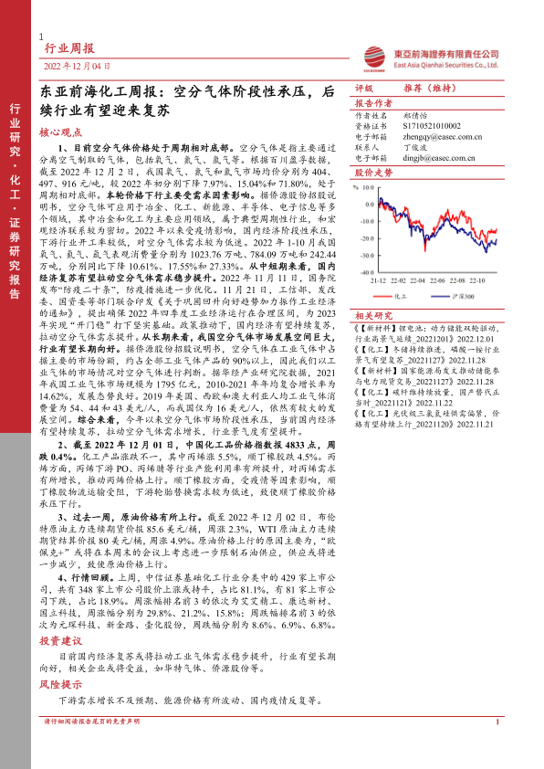 本报告对2022年12月4日一周的化工市场进行了全面分析,重点关注空分气体行业,指出其价格处于周期性底部,但随着国内经济复苏和政策支持,行业有望迎来复苏,长期发展空间巨大。报告还分析了化工品市场整体走势和重点产品价格波动,并对部分上市公司的动态进行了跟踪。投资者需注意下游需求增长不及预期、能源价格波动和国内疫情反复等风险。 报告信息仅供参考,不构成投资建议。