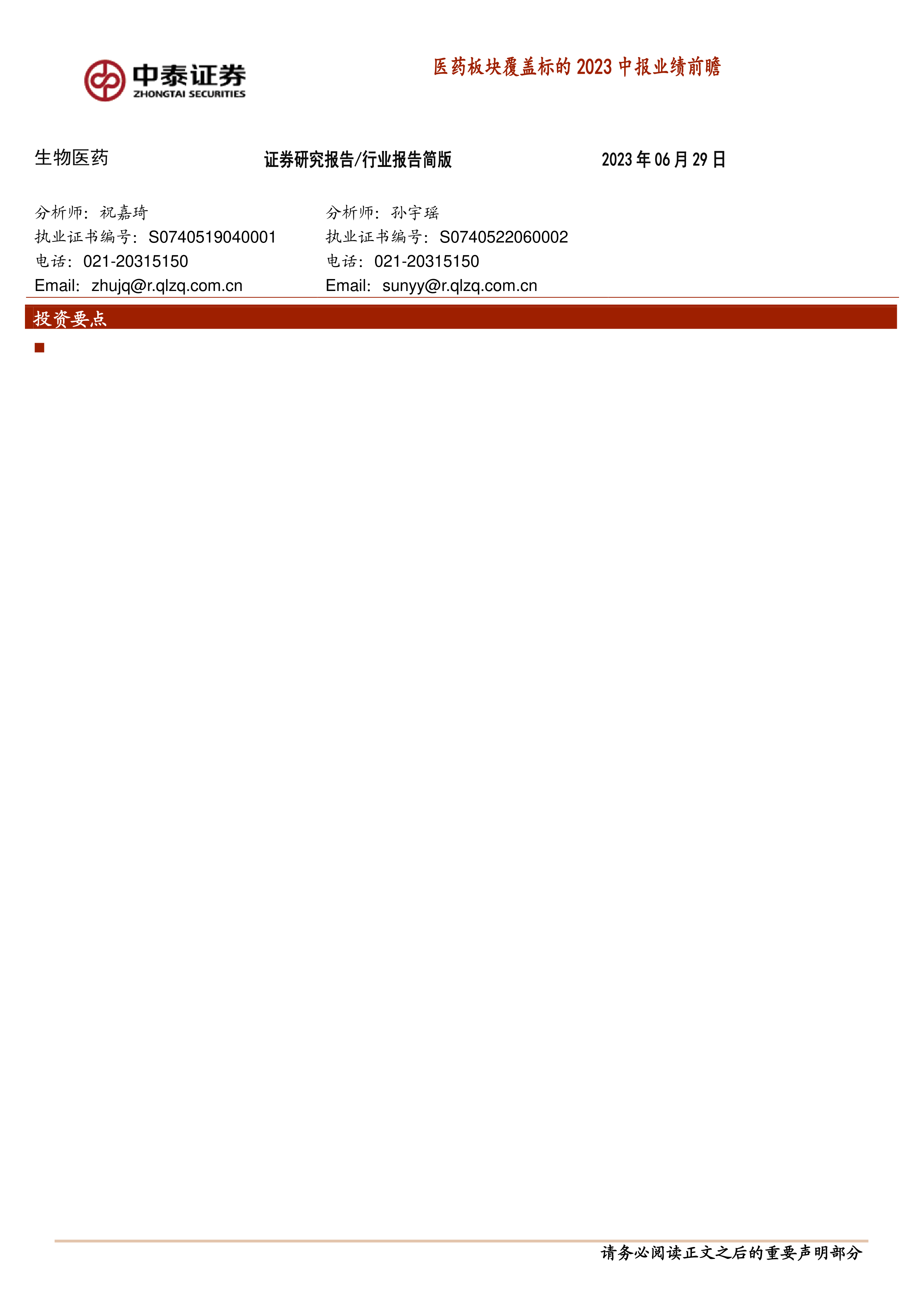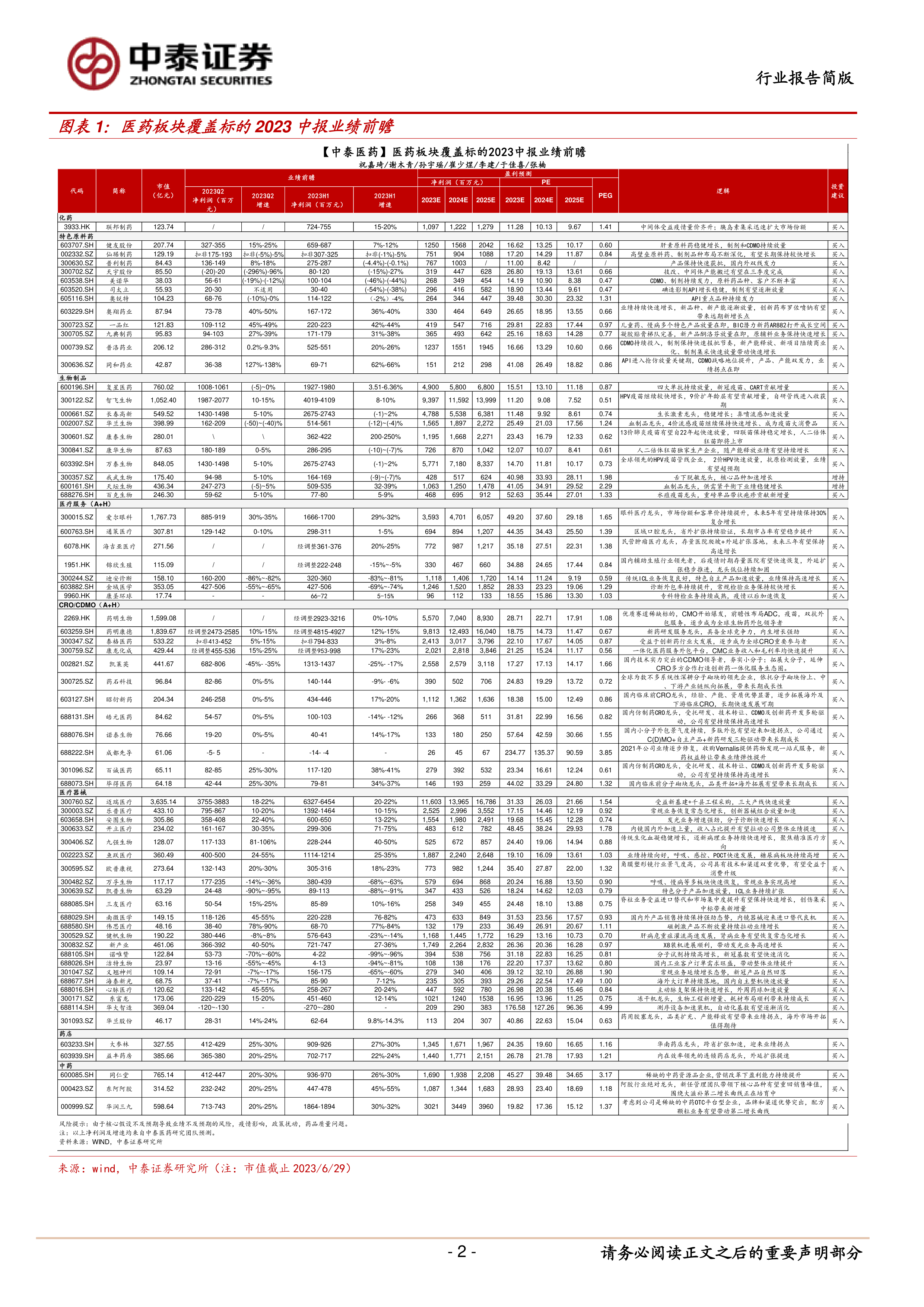 本报告的核心观点是:基于中泰证券研究团队对医药板块2023年中报业绩的前瞻性预测,对覆盖标的的业绩表现进行分析,并给出投资建议。报告涵盖化药、生物制品、医疗服务(A+H)、CRO/CDMO(A+H)、医疗器械以及药店等多个细分领域,并对部分标的给出“买入”或“增持”的投资评级。 报告强调了部分公司业绩增长的驱动因素,例如:中间体受益疫情量价齐升、创新药持续获批、疫苗放量、医疗服务市场份额提升以及CRO/CDMO行业的高速发展等。同时,报告也指出了潜在的风险因素,例如:核心假设不及预期、疫情影响、政策扰动以及药品质量问题等。