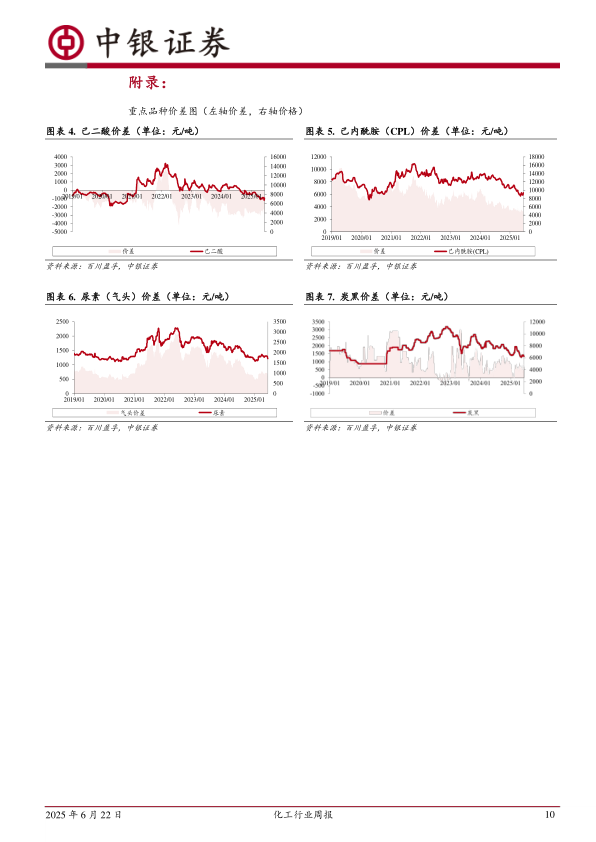 报告首先提供了本周(6月16日至6月22日)化工行业的基本数据:100个化工品种中,41个价格上涨,26个价格下跌,33个价格稳定;38%的产品月均价环比上涨,50%环比下跌,12%持平。重点品种价格变化方面,甲醛(华东)、甲醇(长三角)、NYMEX天然气、对二甲苯(PX东南亚)、PTA(华东)价格上涨;维生素E、维生素A、盐酸(长三角)、重质纯碱(华东)、轻质纯碱(华东)价格下跌。国际油价上涨,WTI原油和布伦特原油分别上涨1.18%和3.75%;NYMEX天然气上涨7.54%。新能源材料方面,碳酸锂价格小幅上涨。