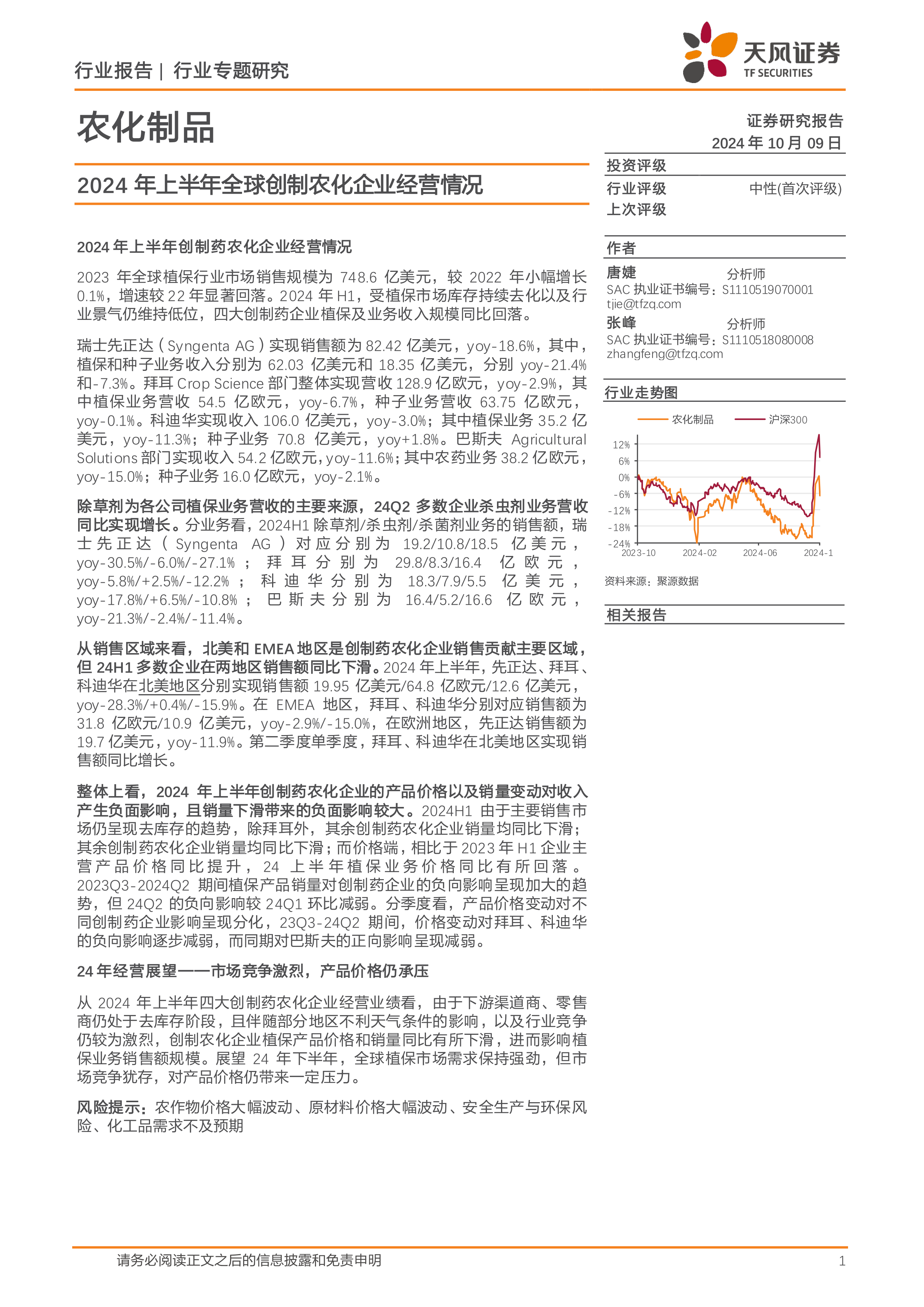 农化制品行业专题研究:2024年上半年全球创制农化企业经营情况