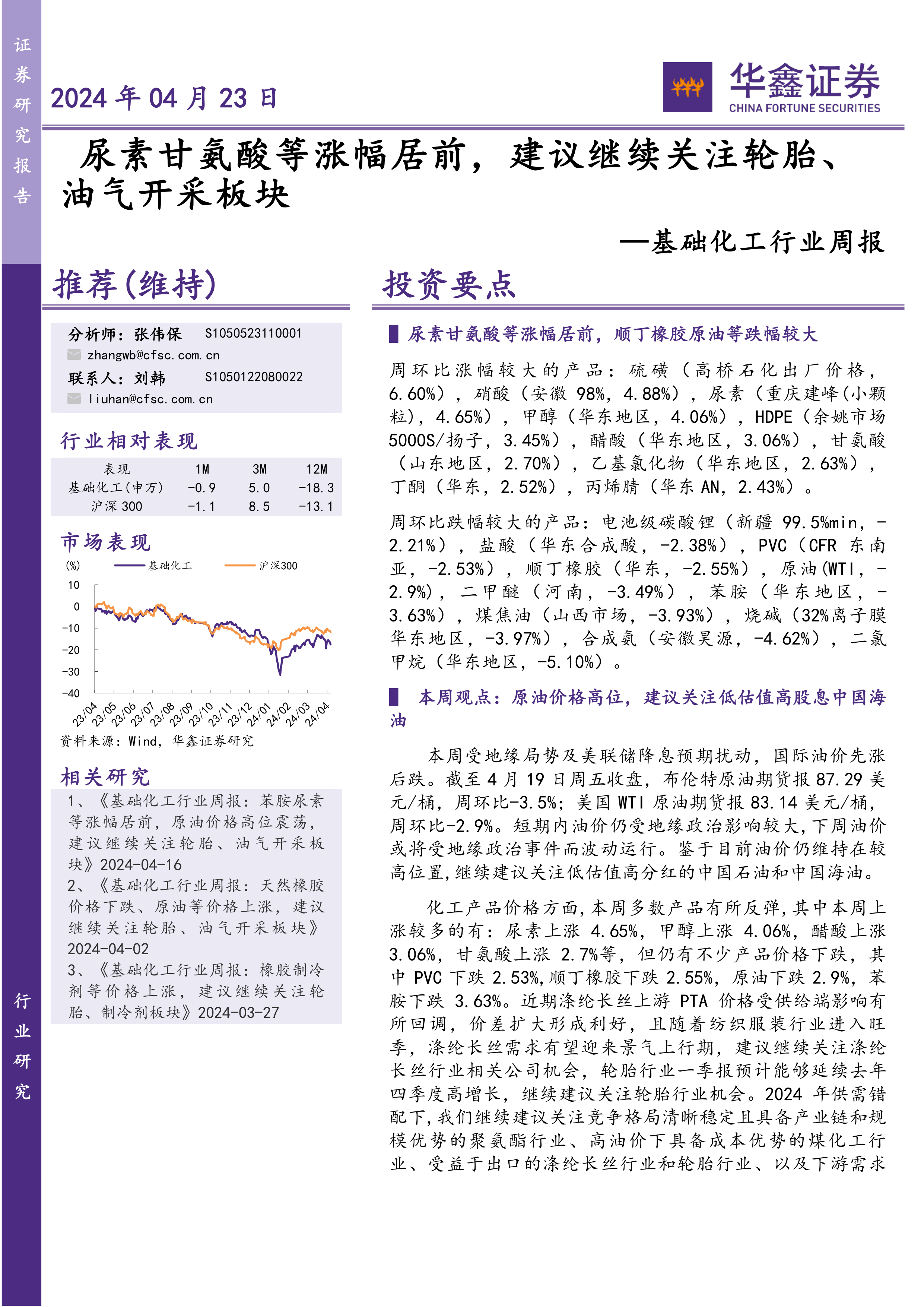基础化工行业周报:尿素甘氨酸等涨幅居前,建议继续关注轮胎、油气开采板块