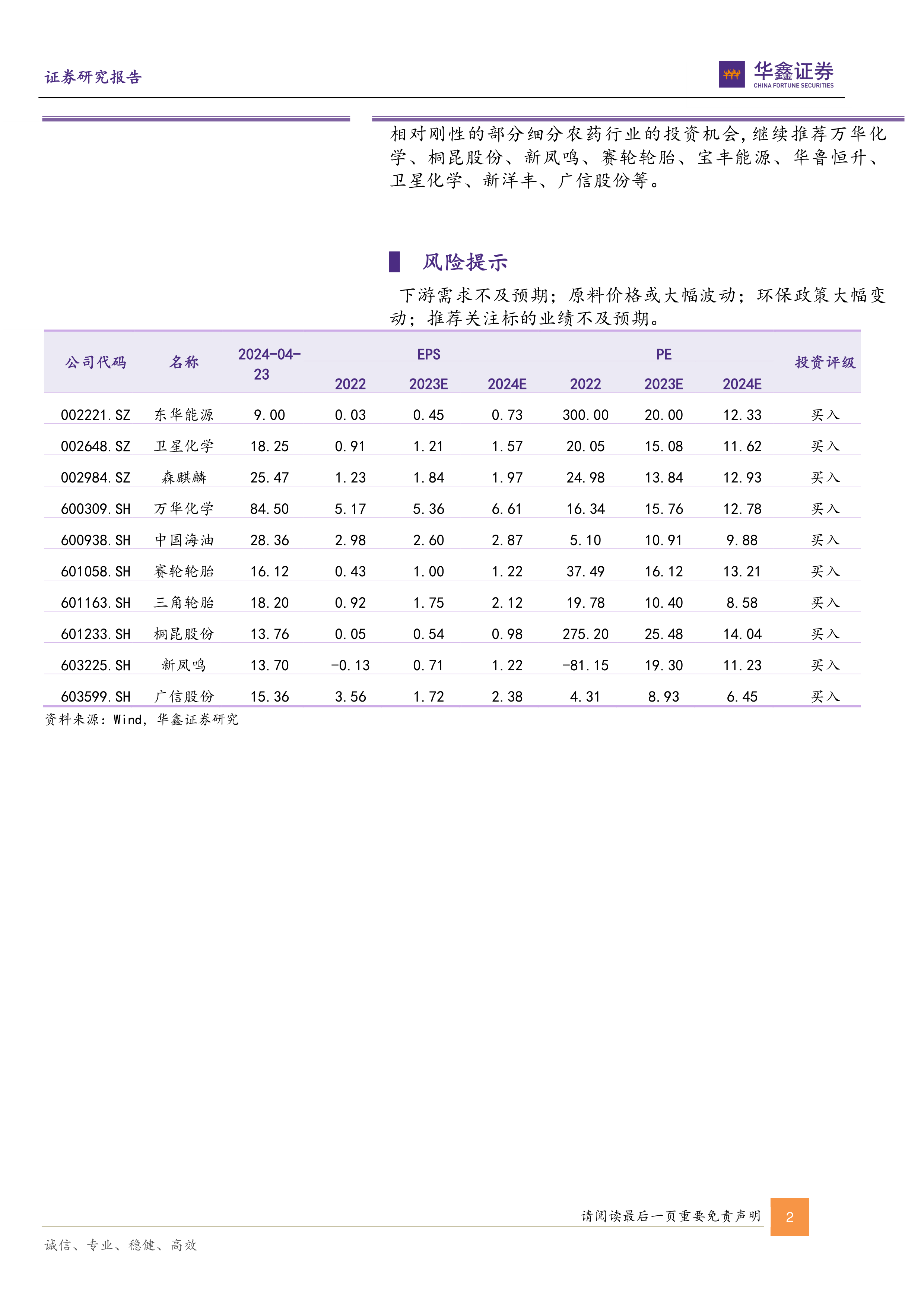 本报告基于公开数据,对2024年4月23日一周的基础化工行业市场进行了专业分析。报告指出,本周化工行业呈现显著分化,原油价格波动是影响价格的主要因素。部分产品价格上涨,部分产品价格下跌。报告建议投资者关注低估值高股息的中国石油和中国海油,以及受供需错配影响,且具备竞争优势的聚氨酯、煤化工、涤纶长丝和轮胎行业。 报告还提供了对重点化工公司的个股分析和投资组合建议,以及对多种化工产品价格走势的详细图表和分析。 投资者需注意报告中提到的下游需求不及预期、原料价格大幅波动、环保政策变化以及公司业绩不及预期等风险。 最终投资决策应基于投资者自身的风险承受能力和投资目标。