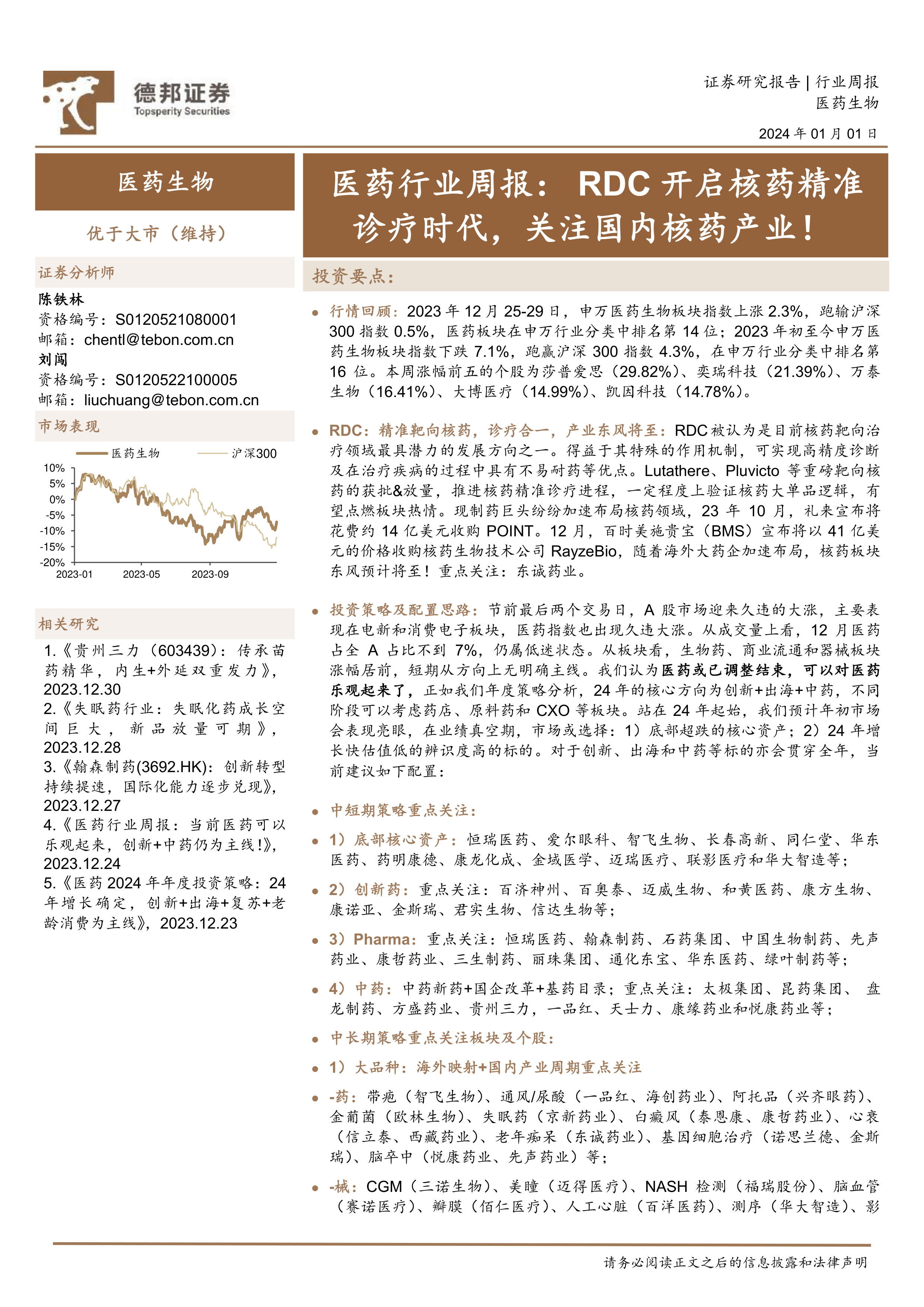 本报告对2023年12月25日至29日医药生物板块的市场行情进行了回顾,并重点分析了RDC核药的市场前景和投资机会。报告指出,RDC核药的精准靶向治疗和诊疗一体化优势,以及海外巨头的积极布局,将推动国内核药产业快速发展。报告建议投资者关注底部核心资产、创新药、Pharma和中药板块,并列举了部分值得关注的个股,为投资者提供了专业的投资参考。 然而,报告也提醒投资者注意行业需求不及预期、上市公司业绩不及预期以及市场竞争加剧等风险。 投资者应根据自身风险承受能力和投资目标,谨慎决策。