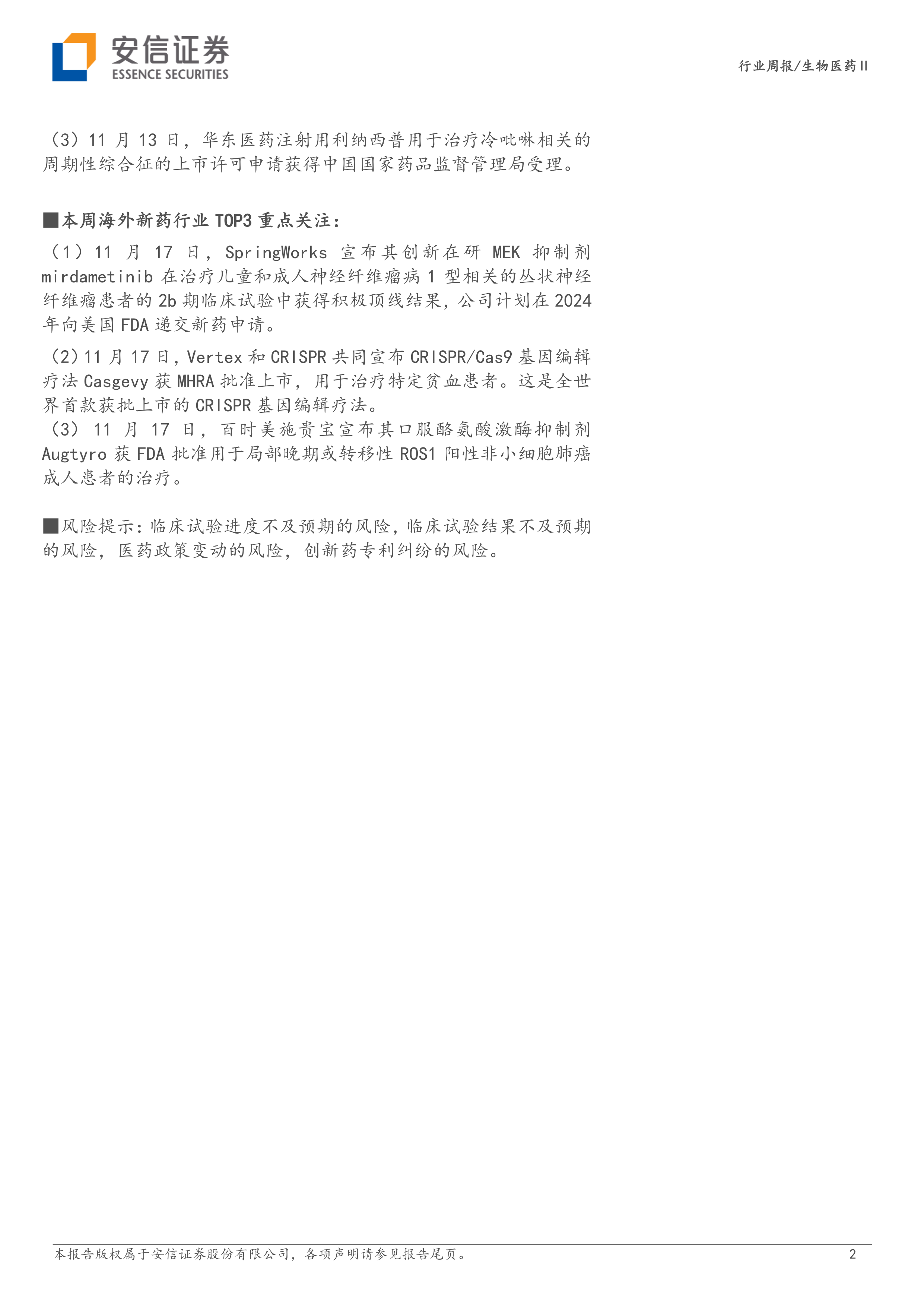 报告最后列出了生物医药行业投资的潜在风险,包括临床试验进度不及预期、临床试验结果不及预期、医药政策变动以及创新药专利纠纷等。