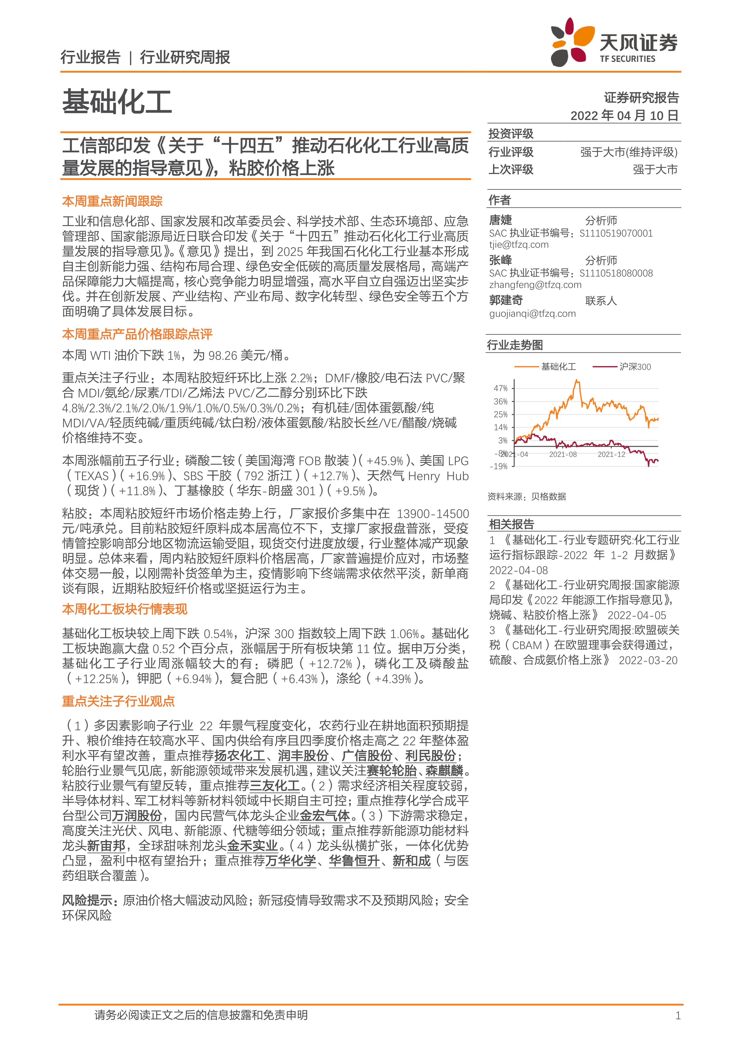 基础化工行业研究周报:工信部印发《关于“十四五”推动石化化工行业高质量发展的指导意见》,粘胶价格上涨