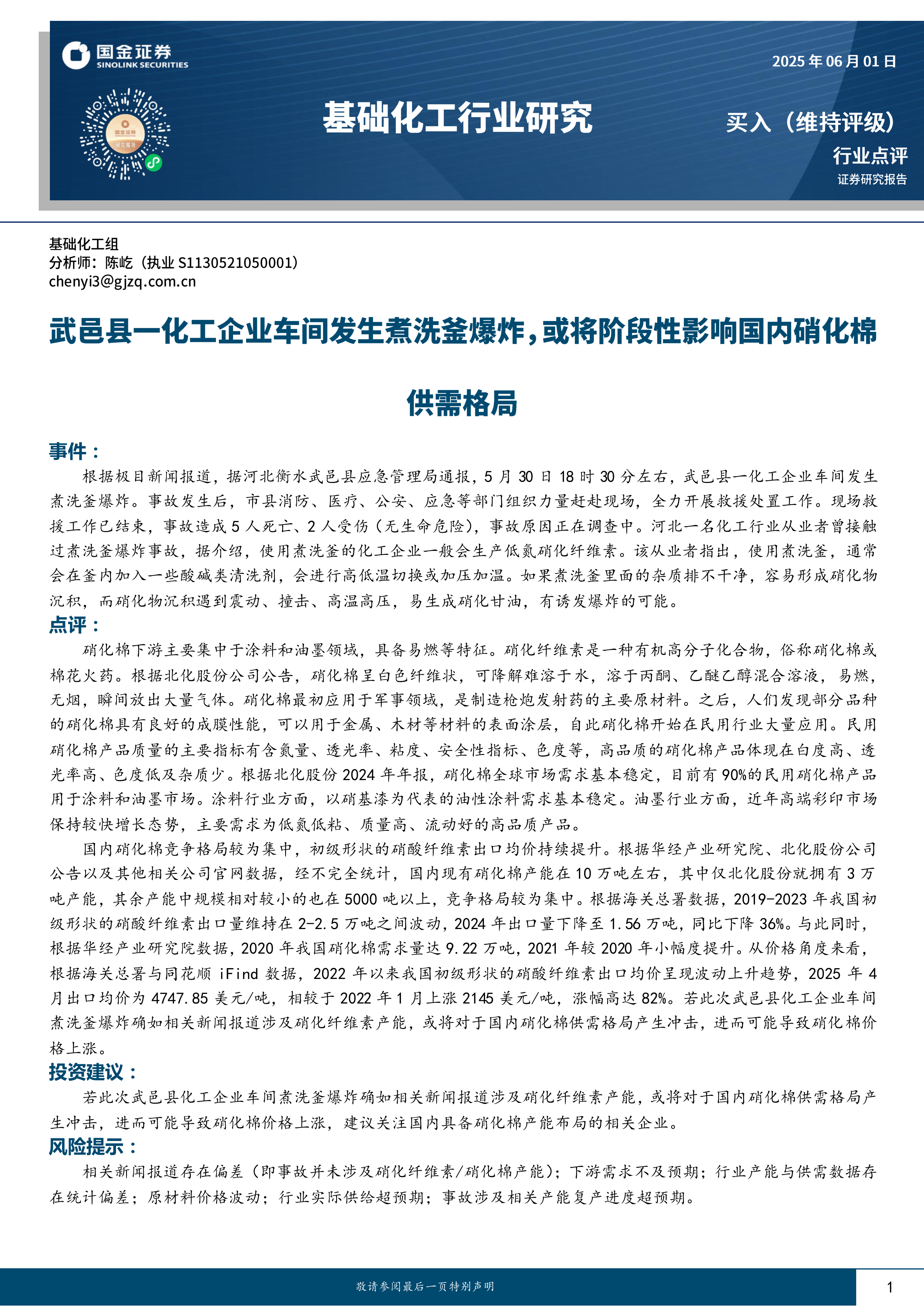 基础化工行业研究:武邑县一化工企业车间发生煮洗釜爆炸,或将阶段性影响国内硝化棉供需格局
