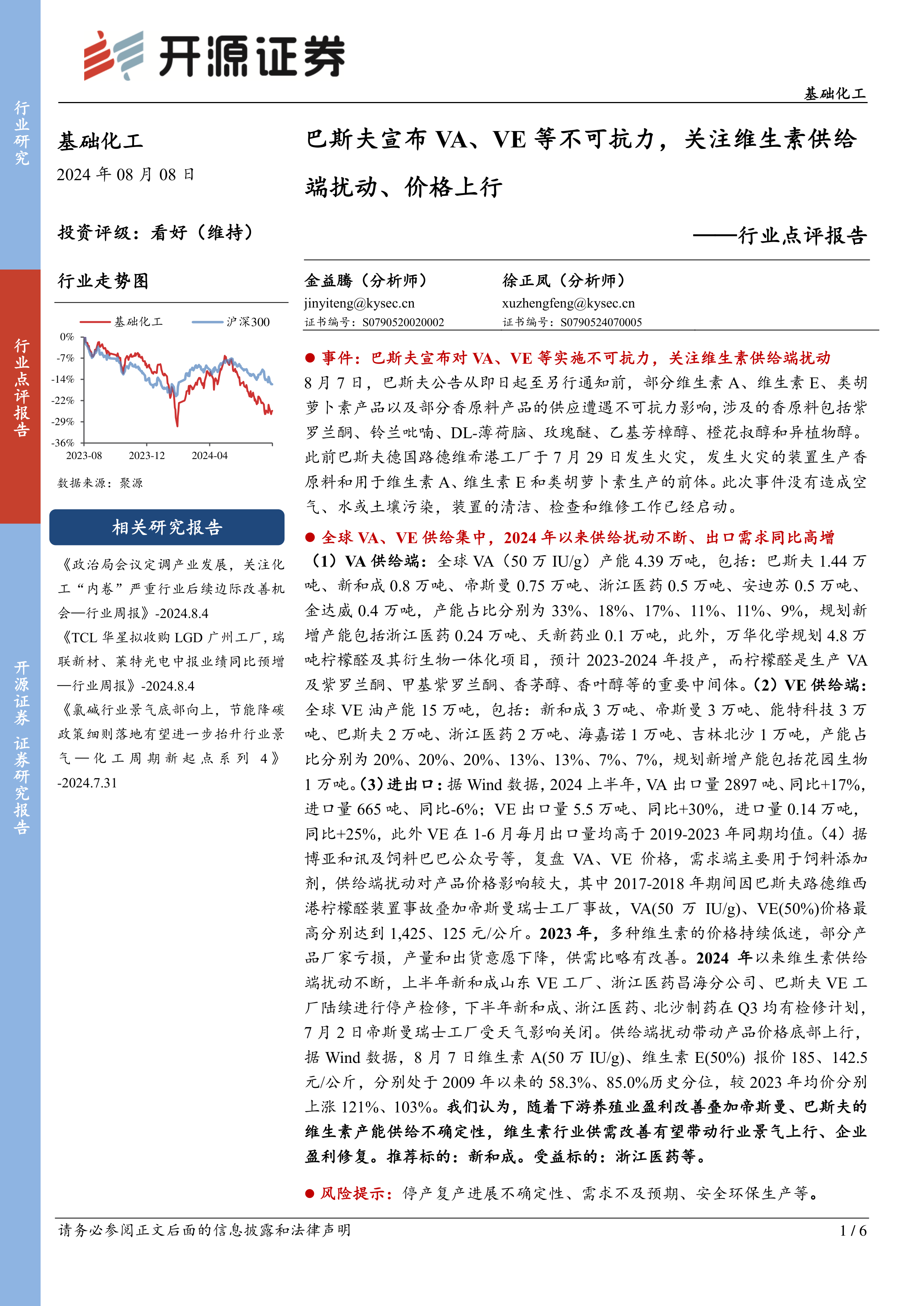 基础化工行业点评报告:巴斯夫宣布VA、VE等不可抗力,关注维生素供给端扰动、价格上行