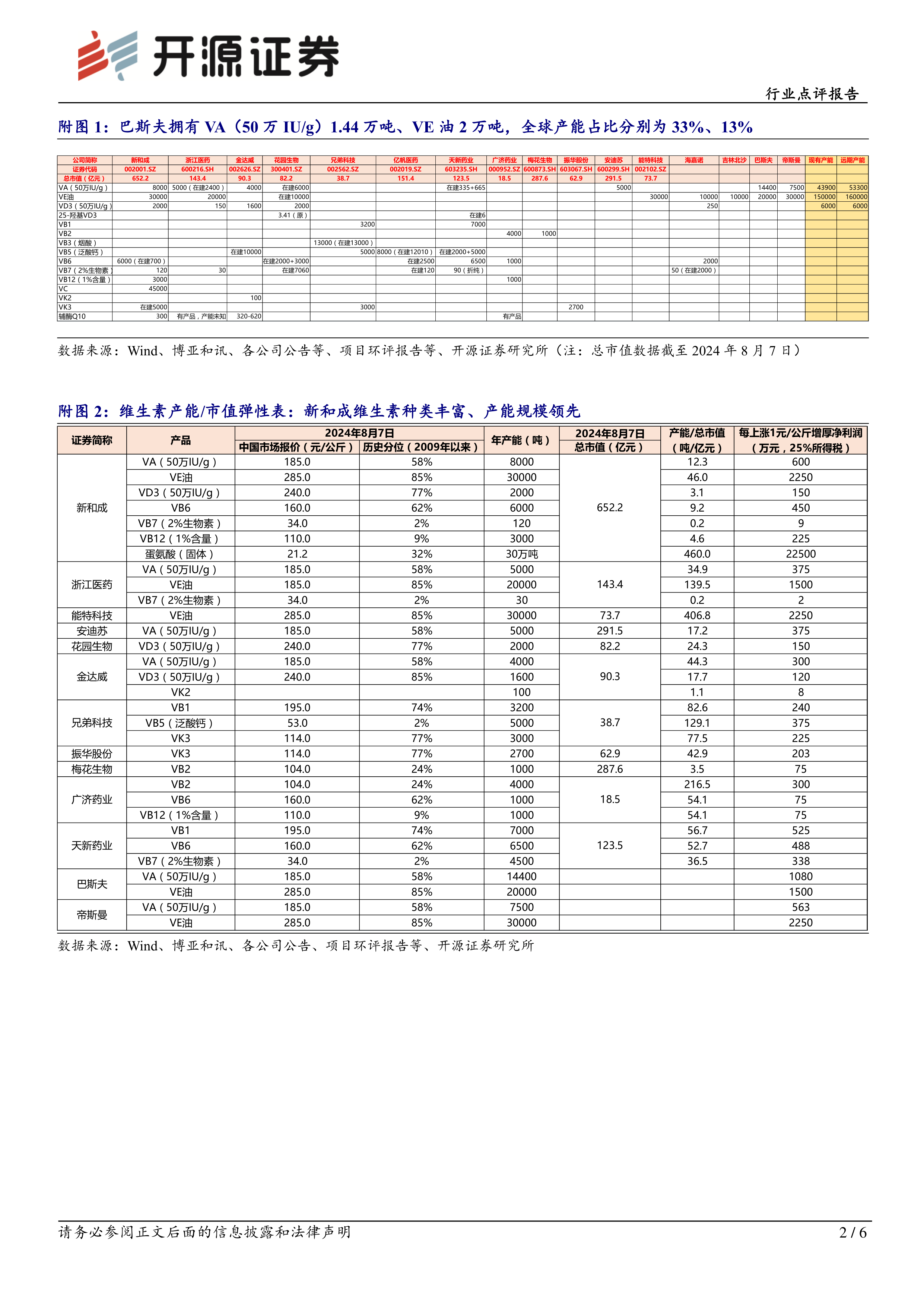 (1)VA供给端:全球VA(50万IU/g)产能4.39万吨,包括:巴斯夫1.44万吨、新和成0.8万吨、帝斯曼0.75万吨、浙江医药0.5万吨、安迪苏0.5万吨、金达威0.4万吨,产能占比分别为33%、18%、17%、11%、11%、9%,规划新增产能包括浙江医药0.24万吨、天新药业0.1万吨,此外,万华化学规划4.8万吨柠檬醛及其衍生物一体化项目,预计2023-2024年投产,而柠檬醛是生产VA及紫罗兰酮、甲基紫罗兰酮、香茅醇、香叶醇等的重要中间体。(2)VE供给端:全球VE油产能15万吨,包括:新和成3万吨、帝斯曼3万吨、能特科技3万吨、巴斯夫2万吨、浙江医药2万吨、海嘉诺1万吨、吉林北沙1万吨,产能占比分别为20%、20%、20%、13%、13%、7%、7%,规划新增产能包括花园生物1万吨。(3)进出口:据Wind数据,2024上半年,VA出口量2897吨、同比+17%,进口量665吨、同比-6%;VE出口量5.5万吨、同比+30%,进口量0.14万吨,同比+25%,此外VE在1-6月每月出口量均高于2019-2023年同期均值。(4)据博亚和讯及饲料巴巴公众号等,复盘VA、VE价格,需求端主要用于饲料添加剂,供给端扰动对产品价格影响较大,其中2017-2018年期间因巴斯夫路德维西港柠檬醛装置事故叠加帝斯曼瑞士工厂事故,VA(50万IU/g)、VE(50%)价格最高分别达到1,425、125元/公斤。2023年,多种维生素的价格持续低迷,部分产品厂家亏损,产量和出货意愿下降,供需比略有改善。2024年以来维生素供给端扰动不断,上半年新和成山东VE工厂、浙江医药昌海分公司、巴斯夫VE工厂陆续进行停产检修,下半年新和成、浙江医药、北沙制药在Q3均有检修计划,7月2日帝斯曼瑞士工厂受天气影响关闭。供给端扰动带动产品价格底部上行,据Wind数据,8月7日维生素A(50万IU/g)、维生素E(50%)报价185、142.5元/公斤,分别处于2009年以来的58.3%、85.0%历史分位,较2023年均价分别上涨121%、103%。我们认为,随着下游养殖业盈利改善叠加帝斯曼、巴斯夫的维生素产能供给不确定性,维生素行业供需改善有望带动行业景气上行、企业盈利修复。推荐标的:新和成。受益标的:浙江医药等。