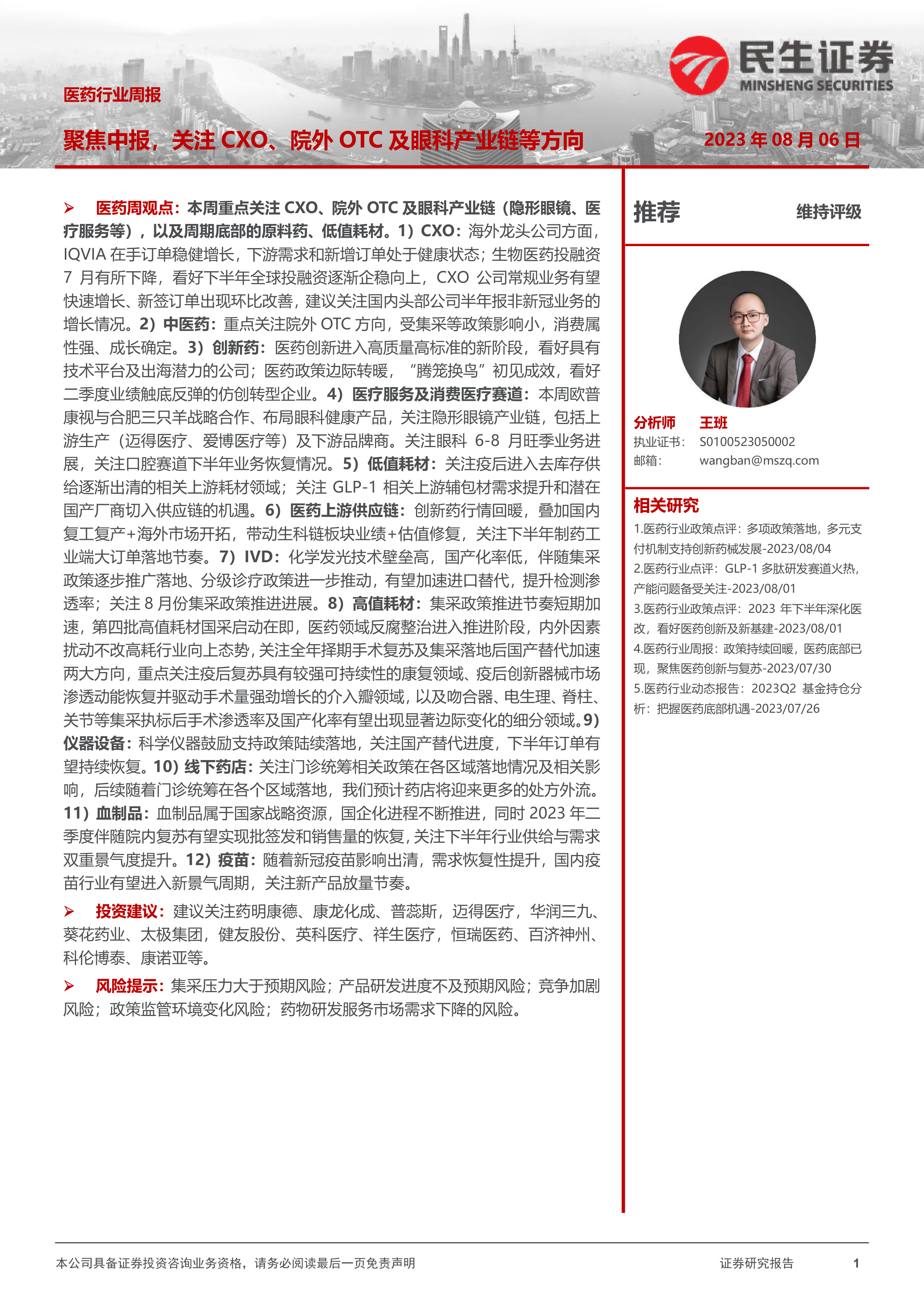 医药周观点: 本周重点关注 CXO、院外 OTC 及眼科产业链(隐形眼镜、医疗服务等),以及周期底部的原料药、低值耗材。 1) CXO: 海外龙头公司方面,IQVIA 在手订单稳健增长, 下游需求和新增订单处于健康状态; 生物医药投融资7 月有所下降,看好下半年全球投融资逐渐企稳向上, CXO 公司常规业务有望快速增长、新签订单出现环比改善, 建议关注国内头部公司半年报非新冠业务的增长情况。 2)中医药: 重点关注院外 OTC 方向,受集采等政策影响小,消费属性强、成长确定。 3)创新药: 医药创新进入高质量高标准的新阶段,看好具有技术平台及出海潜力的公司; 医药政策边际转暖, “腾笼换鸟”初见成效, 看好二季度业绩触底反弹的仿创转型企业。 4)医疗服务及消费医疗赛道: 本周欧普康视与合肥三只羊战略合作、布局眼科健康产品, 关注隐形眼镜产业链, 包括上游生产(迈得医疗、爱博医疗等)及下游品牌商。 关注眼科 6-8 月旺季业务进展,关注口腔赛道下半年业务恢复情况。 5)低值耗材: 关注疫后进入去库存供给逐渐出清的相关上游耗材领域; 关注 GLP-1 相关上游辅包材需求提升和潜在国产厂商切入供应链的机遇。 6)医药上游供应链: 创新药行情回暖,叠加国内复工复产+海外市场开拓,带动生科链板块业绩+估值修复,关注下半年制药工业端大订单落地节奏。 7) IVD: 化学发光技术壁垒高,国产化率低,伴随集采政策逐步推广落地、分级诊疗政策进一步推动,有望加速进口替代,提升检测渗透率; 关注 8 月份集采政策推进进展。 8)高值耗材: 集采政策推进节奏短期加速,第四批高值耗材国采启动在即, 医药领域反腐整治进入推进阶段, 内外因素扰动不改高耗行业向上态势,关注全年择期手术复苏及集采落地后国产替代加速两大方向,重点关注疫后复苏具有较强可持续性的康复领域、 疫后创新器械市场渗透动能恢复并驱动手术量强劲增长的介入瓣领域,以及吻合器、电生理、脊柱、关节等集采执标后手术渗透率及国产化率有望出现显著边际变化的细分领域。 9)仪器设备: 科学仪器鼓励支持政策陆续落地,关注国产替代进度,下半年订单有望持续恢复。 10)线下药店: 关注门诊统筹相关政策在各区域落地情况及相关影响,后续随着门诊统筹在各个区域落地,我们预计药店将迎来更多的处方外流。11)血制品: 血制品属于国家战略资源,国企化进程不断推进,同时 2023 年二季度伴随院内复苏有望实现批签发和销售量的恢复,关注下半年行业供给与需求双重景气度提升。 12)疫苗: 随着新冠疫苗影响出清,需求恢复性提升,国内疫苗行业有望进入新景气周期,关注新产品放量节奏。