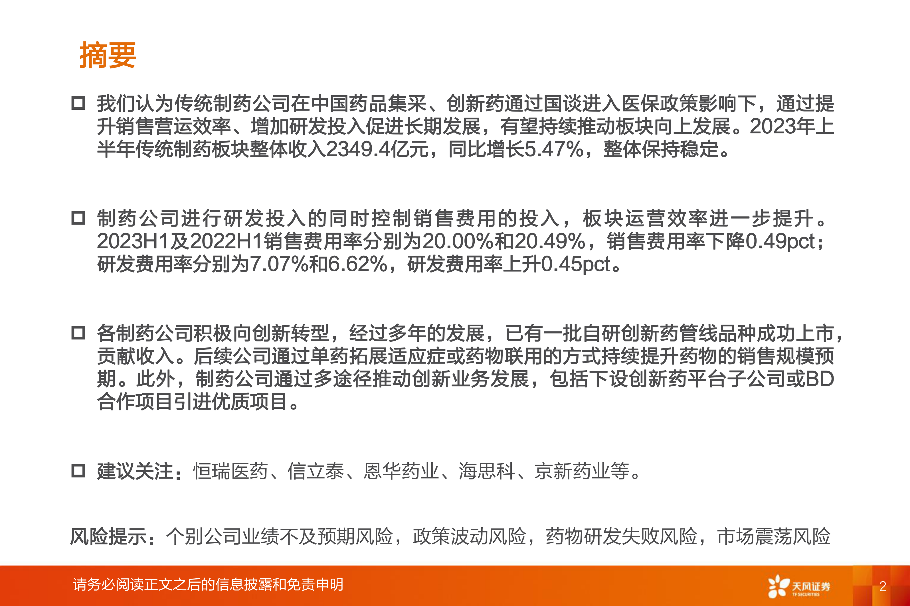 本报告的核心观点是:在药品集采和创新药医保政策的双重影响下,中国传统制药行业2023年上半年整体保持稳定增长,但面临着挑战与机遇并存的局面。传统制药企业通过提升销售运营效率、增加研发投入,积极向创新转型,寻求长期发展。报告建议关注恒瑞医药、信立泰、恩华药业、海思科、京新药业等公司。