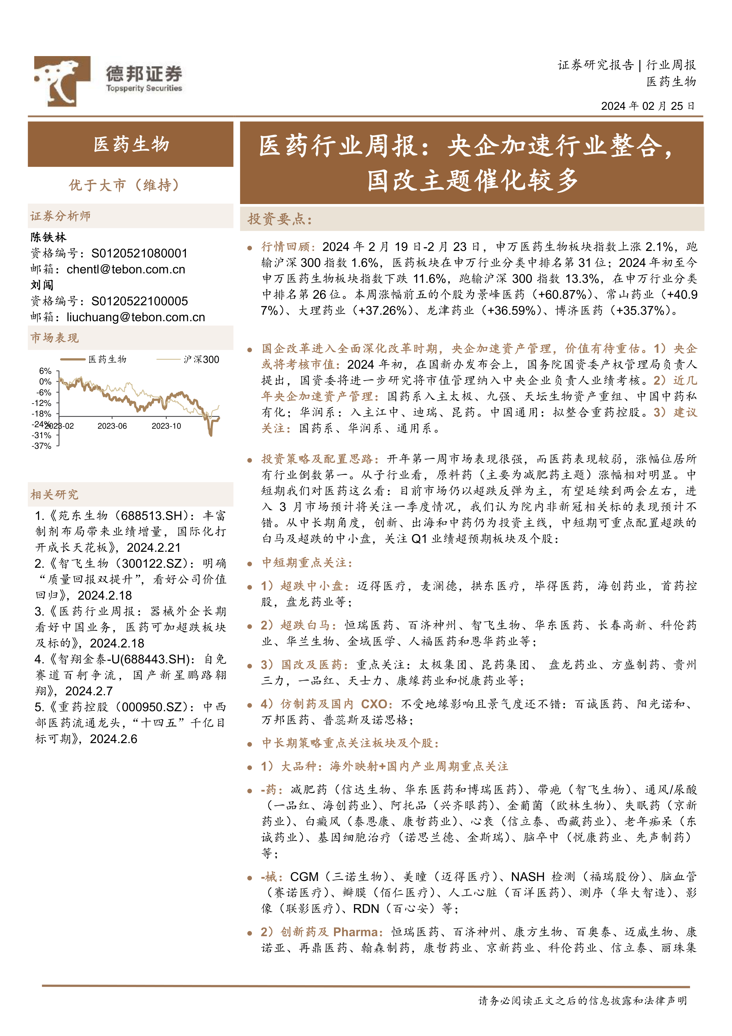 医药行业周报:央企加速行业整合,国改主题催化较多