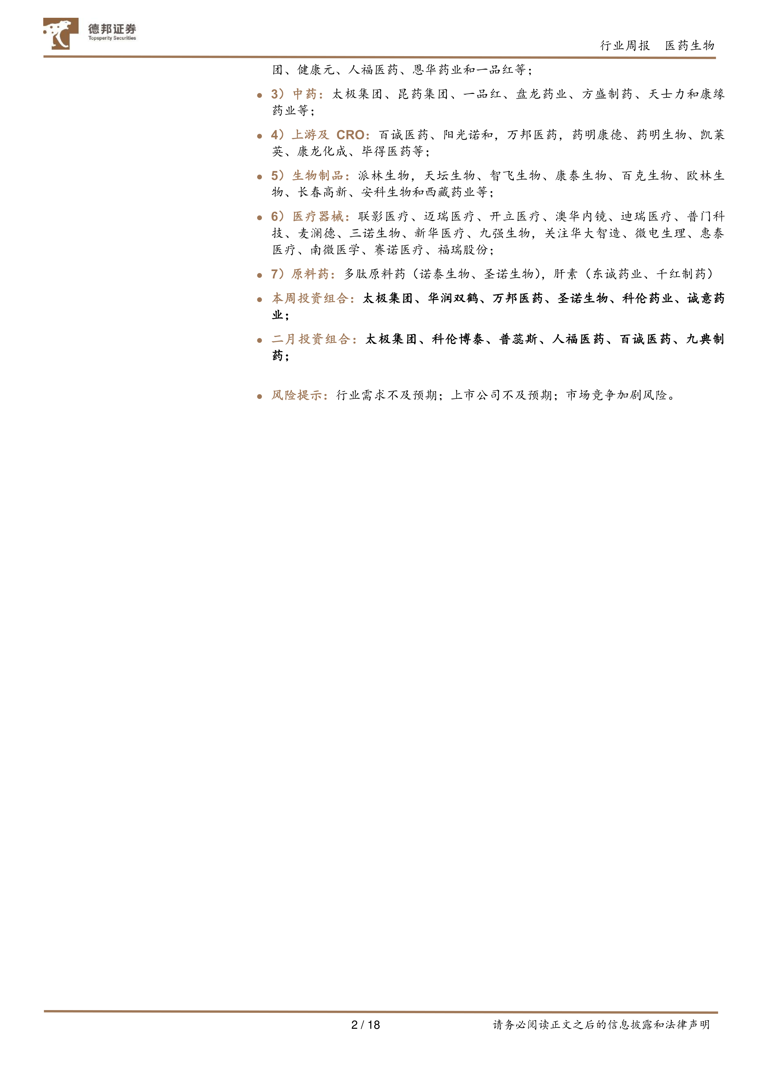 本周投资组合:太极集团、华润双鹤、万邦医药、圣诺生物、科伦药业、诚意药业;