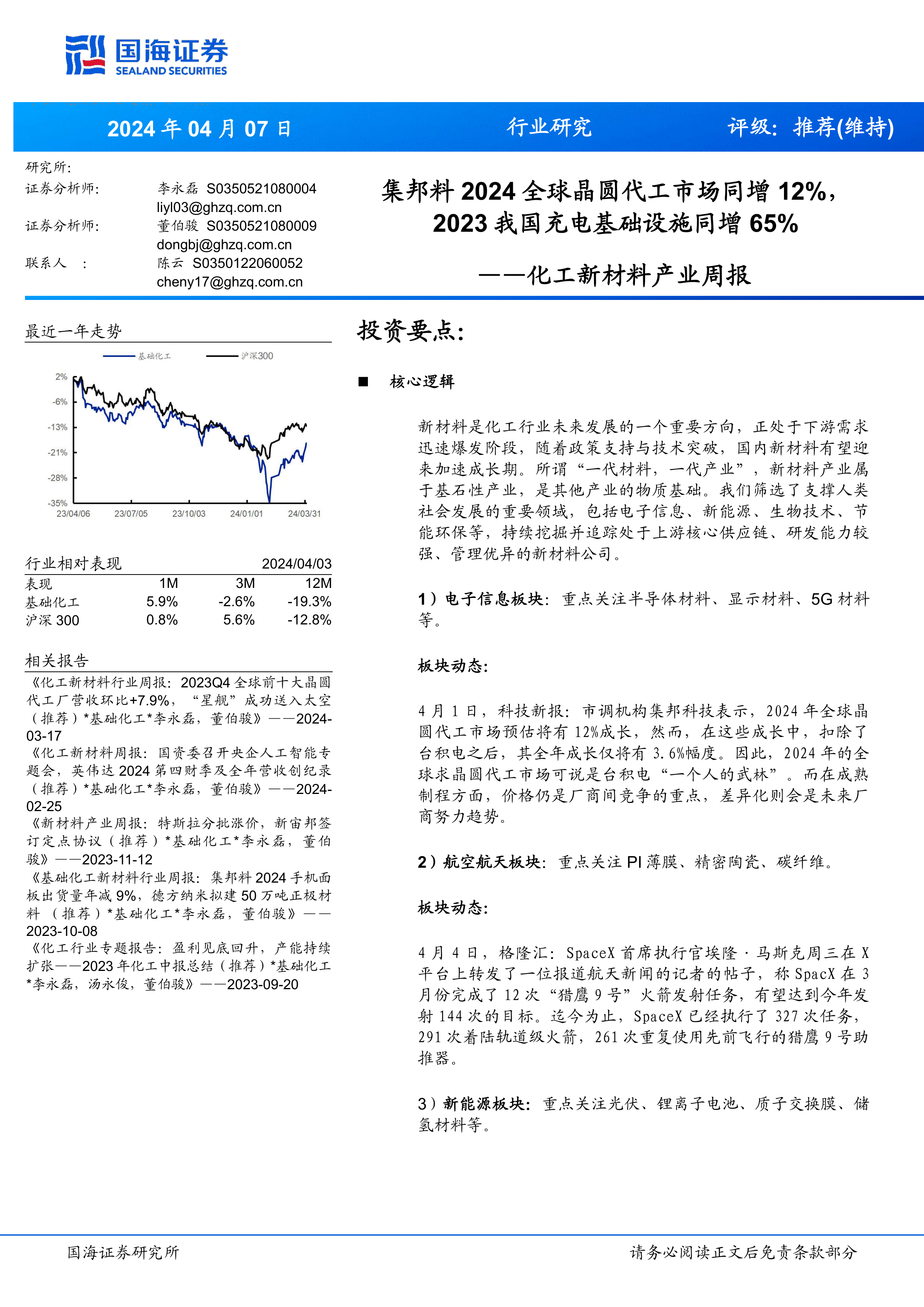 化工新材料产业周报:全球晶圆代工市场同增12%,2023我国充电基础设施同增65%