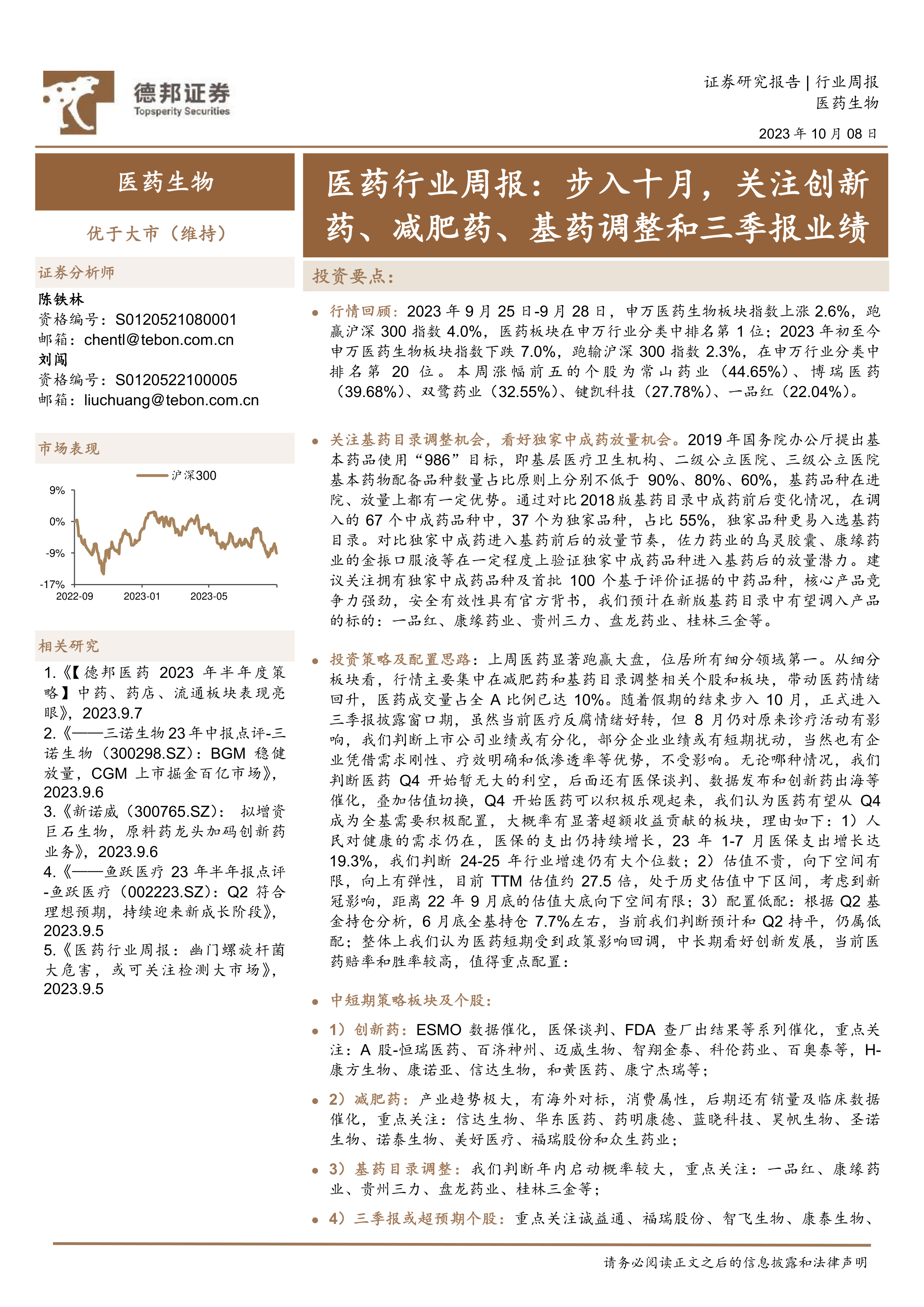 短期内,应关注创新药(ESMO数据催化、医保谈判等)、减肥药(产业趋势、消费属性)、基药目录调整(独家中成药放量)、以及三季报可能超预期的个股。