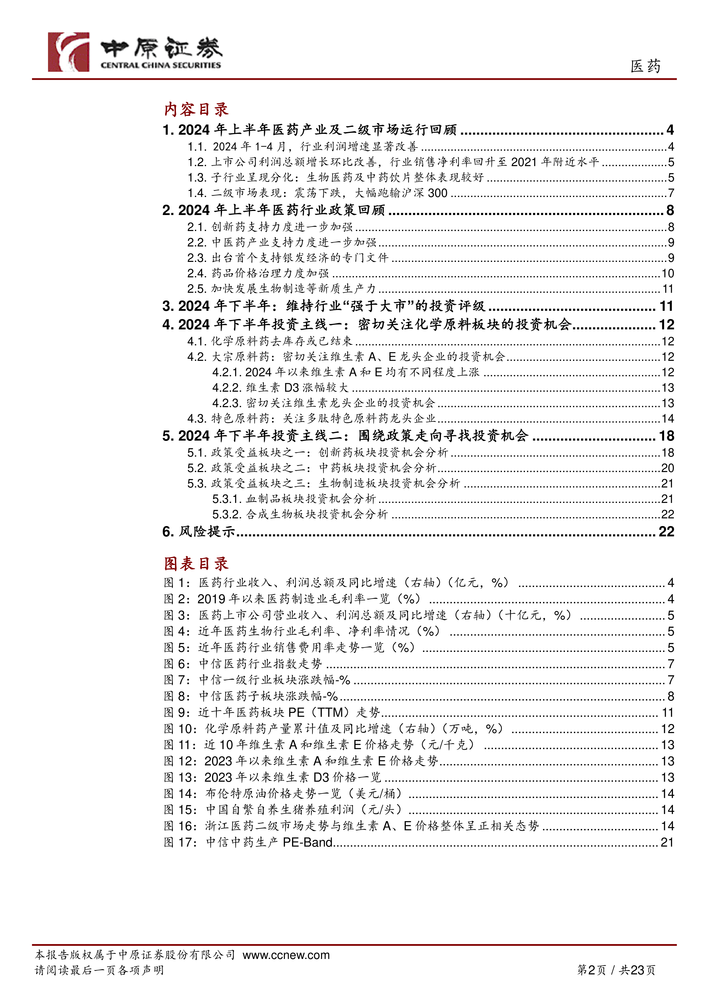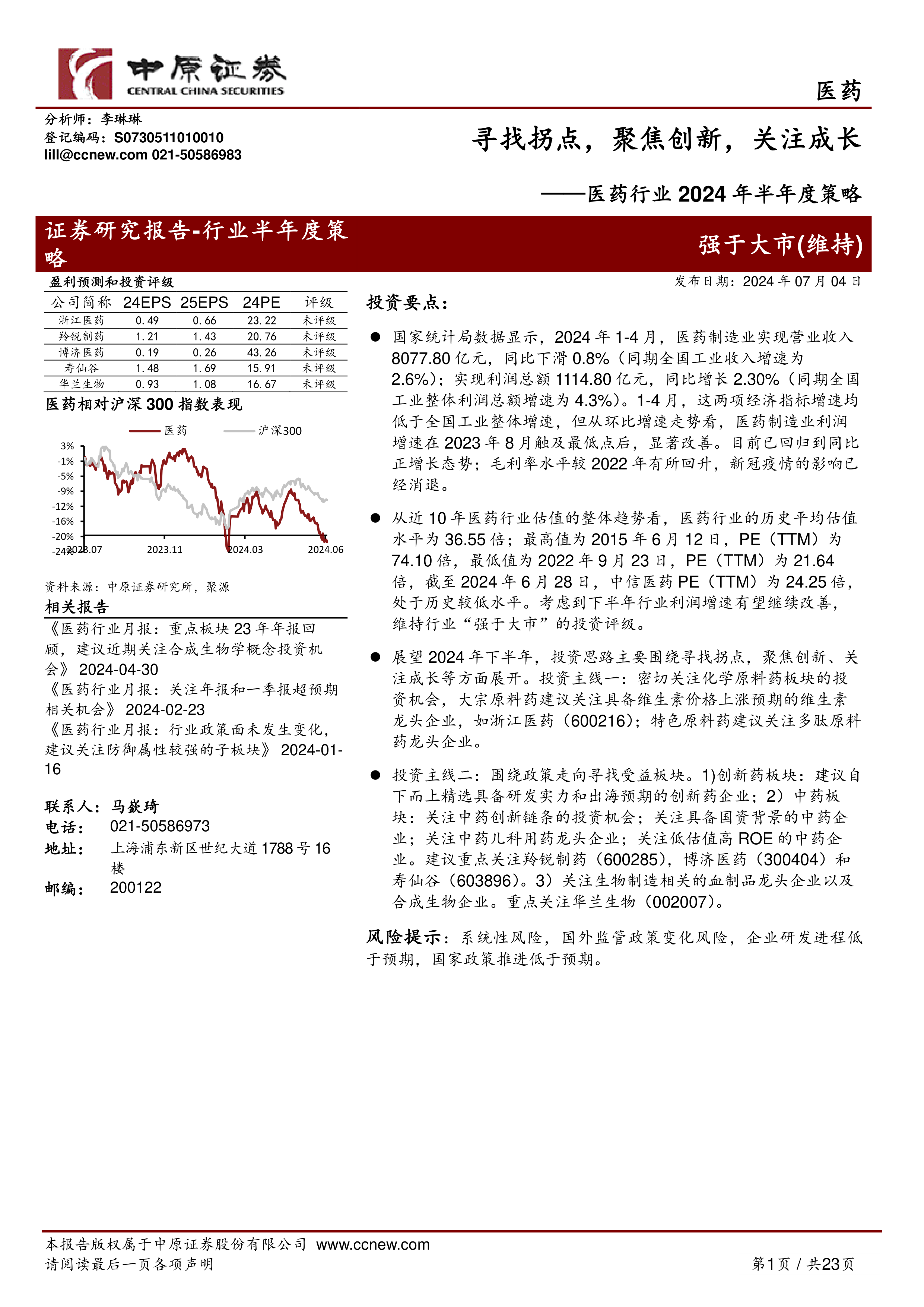 本报告的核心观点是:2024年上半年医药行业整体表现虽不及全国工业整体增速,但利润增速已显著改善,并呈现出积极的复苏态势。下半年,医药行业有望继续保持“强于大市”的投资评级,投资策略应聚焦于寻找行业拐点,关注创新和成长性板块。具体而言,应密切关注化学原料药(特别是维生素龙头企业)、政策受益板块(创新药、中药、生物制造)的投资机会。