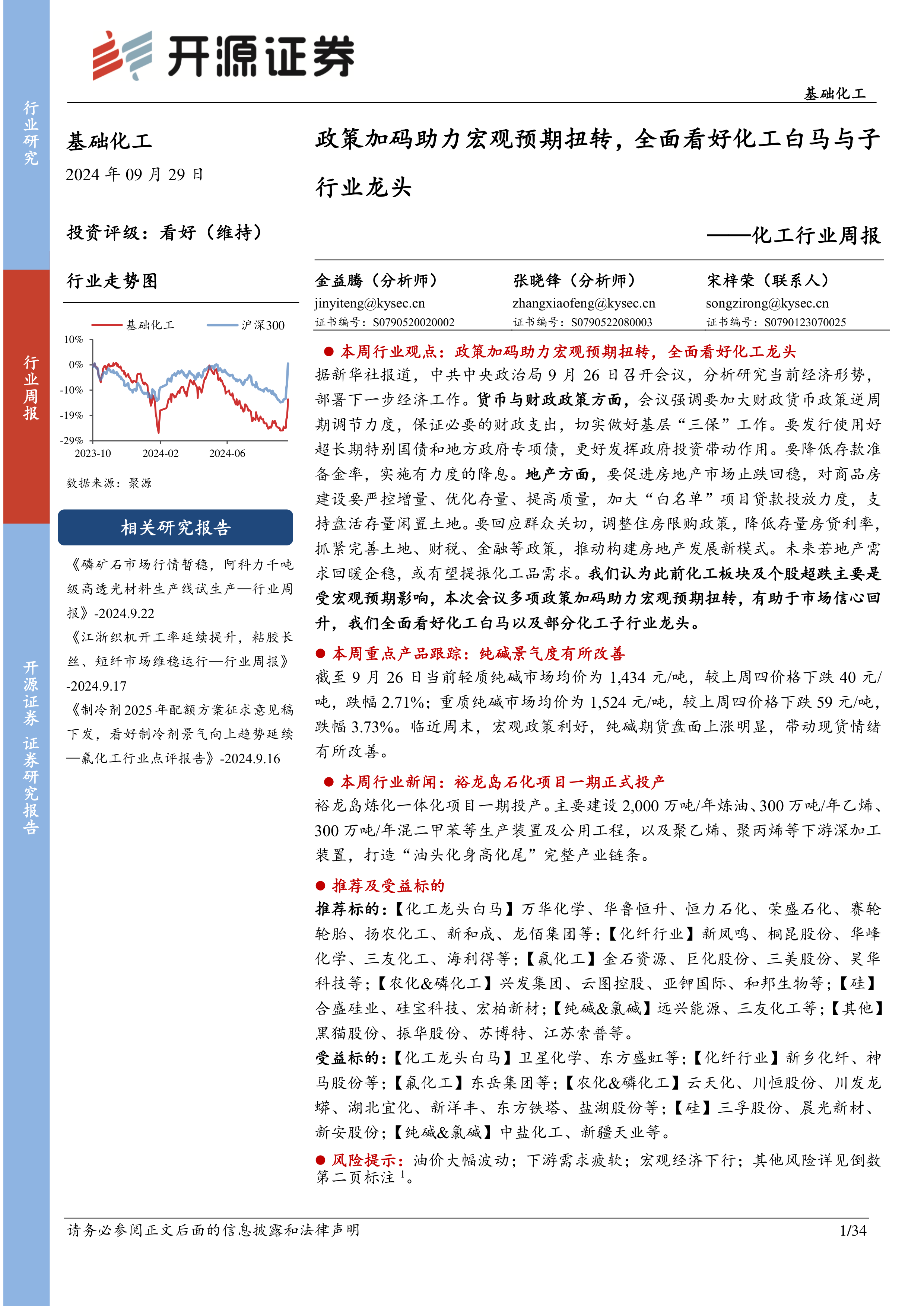 本报告的核心观点是:政策加码助力宏观预期扭转,全面看好化工龙头企业及部分子行业龙头。 具体而言,报告基于近期中央政治局会议释放的积极信号,分析了宏观经济环境对化工行业的影响,并结合化工产品价格、价差、股票行情等数据,对化工行业未来走势做出乐观预测,重点推荐化工龙头白马股及部分子行业龙头企业。