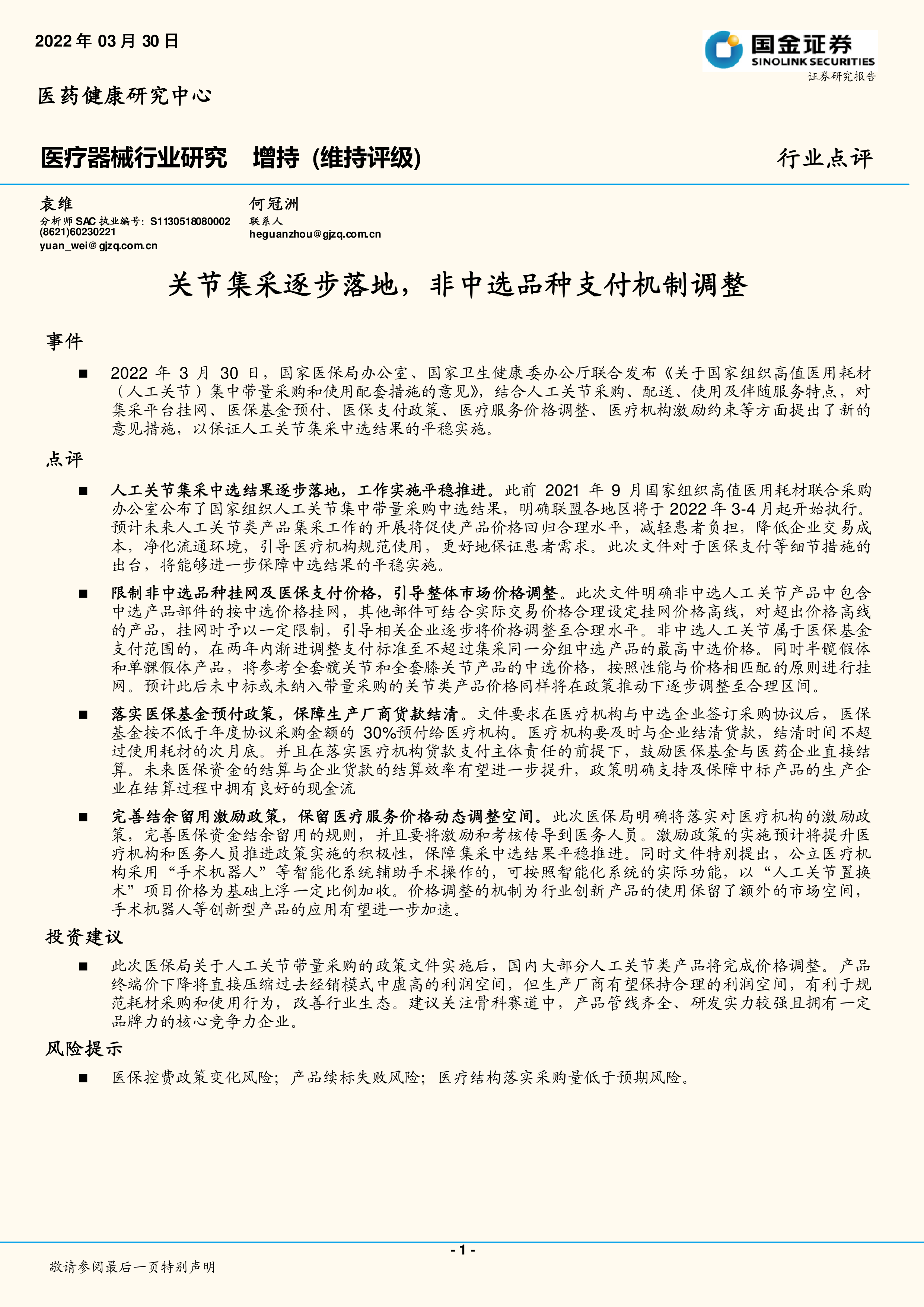 医疗器械行业研究:关节集采逐步落地,非中选品种支付机制调整