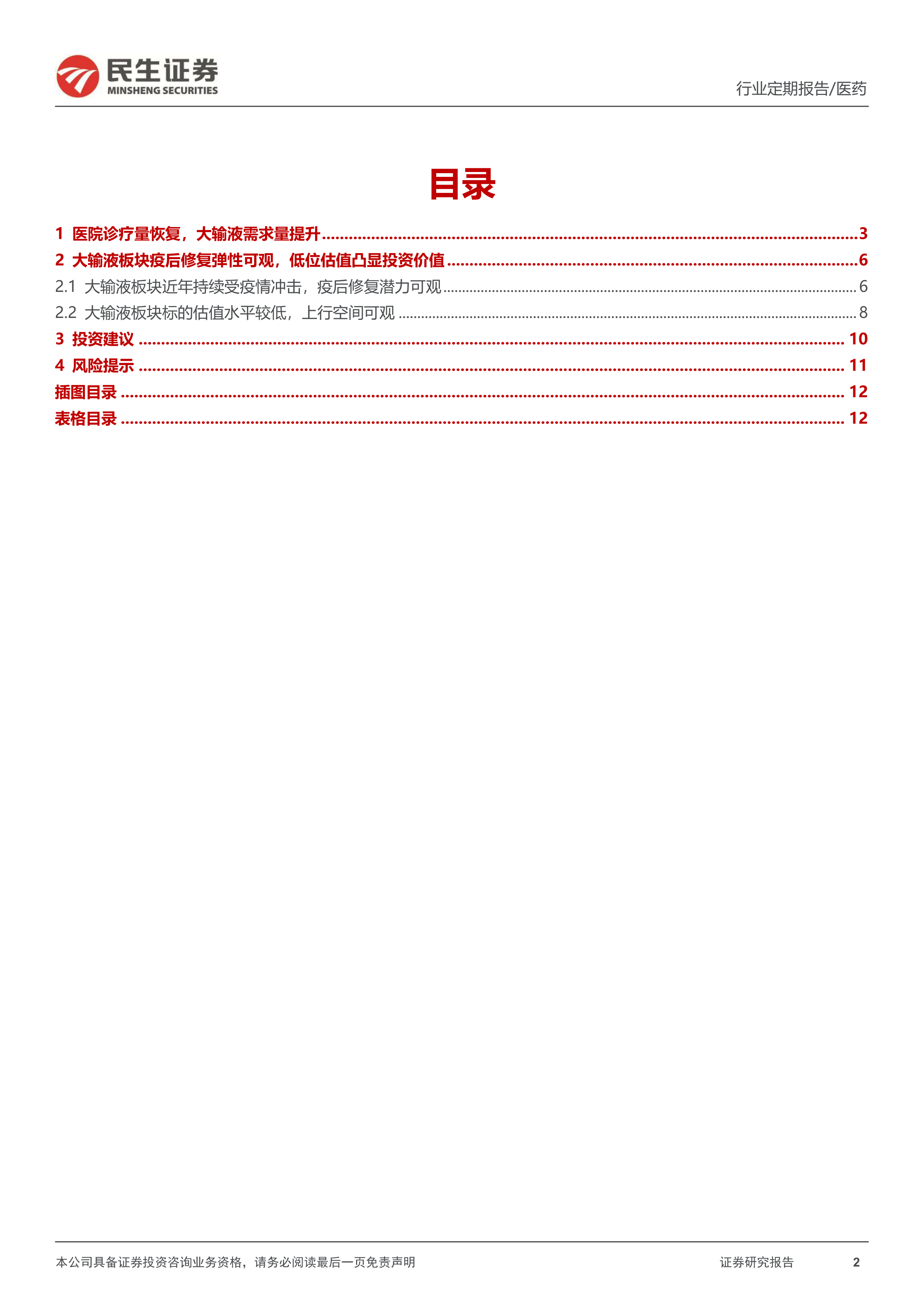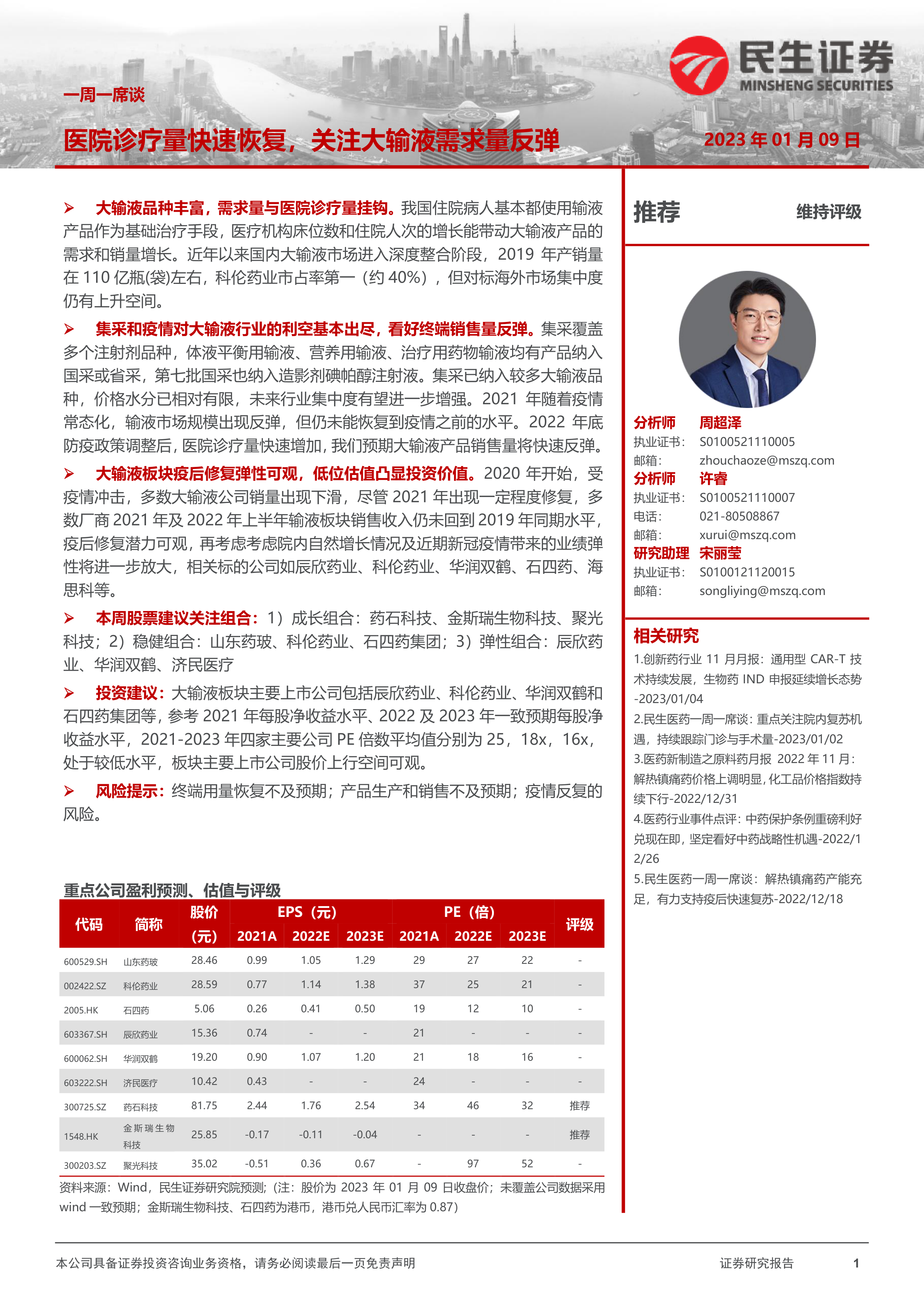 本报告的核心观点是:中国大输液市场在经历了集采和疫情的冲击后,正迎来复苏。医院诊疗量的快速恢复将带动大输液需求量的反弹,行业集中度有望进一步提升。目前大输液板块估值较低,投资价值凸显,部分公司具有较大的上行空间。