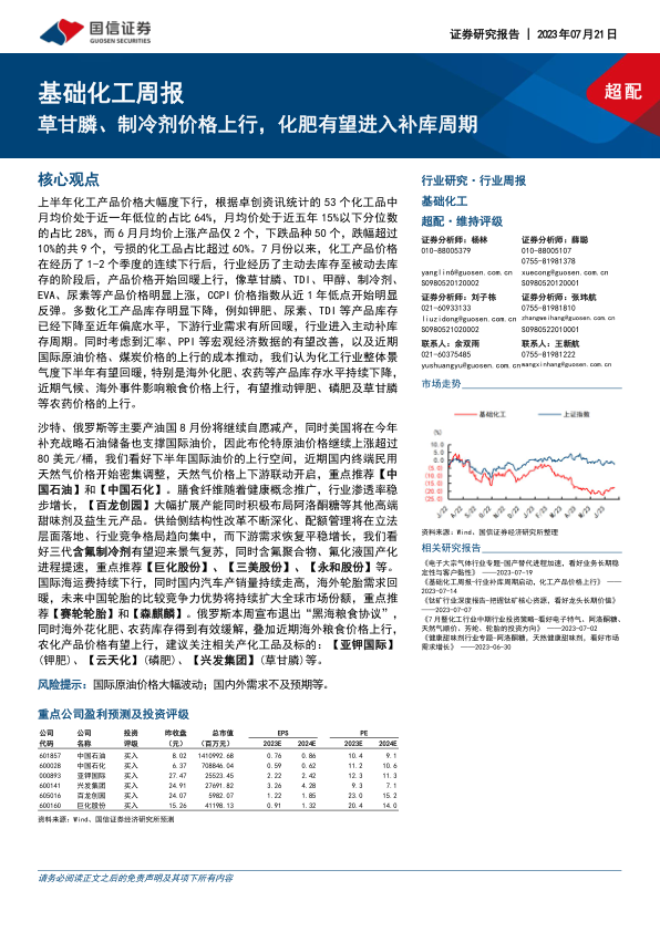 上半年化工产品价格大幅度下行,根据卓创资讯统计的53个化工品中月均价处于近一年低位的占比64%,月均价处于近五年15%以下分位数的占比28%,而6月月均价上涨产品仅2个,下跌品种50个,跌幅超过10%的共9个,亏损的化工品占比超过60%。7月份以来,化工产品价格在经历了1-2个季度的连续下行后,行业经历了主动去库存至被动去库存的阶段后,产品价格开始回暖上行,像草甘膦、TDI、甲醇、制冷剂、EVA、尿素等产品价格明显上涨,CCPI价格指数从近1年低点开始明显反弹。多数化工产品库存明显下降,例如钾肥、尿素、TDI等产品库存已经下降至近年偏底水平,下游行业需求有所回暖,行业进入主动补库存周期。同时考虑到汇率、PPI等宏观经济数据的有望改善,以及近期国际原油价格、煤炭价格的上行的成本推动,我们认为化工行业整体景气度下半年有望回暖,特别是海外化肥、农药等产品库存水平持续下降,近期气候、海外事件影响粮食价格上行,有望推动钾肥、磷肥及草甘膦等农药价格的上行。