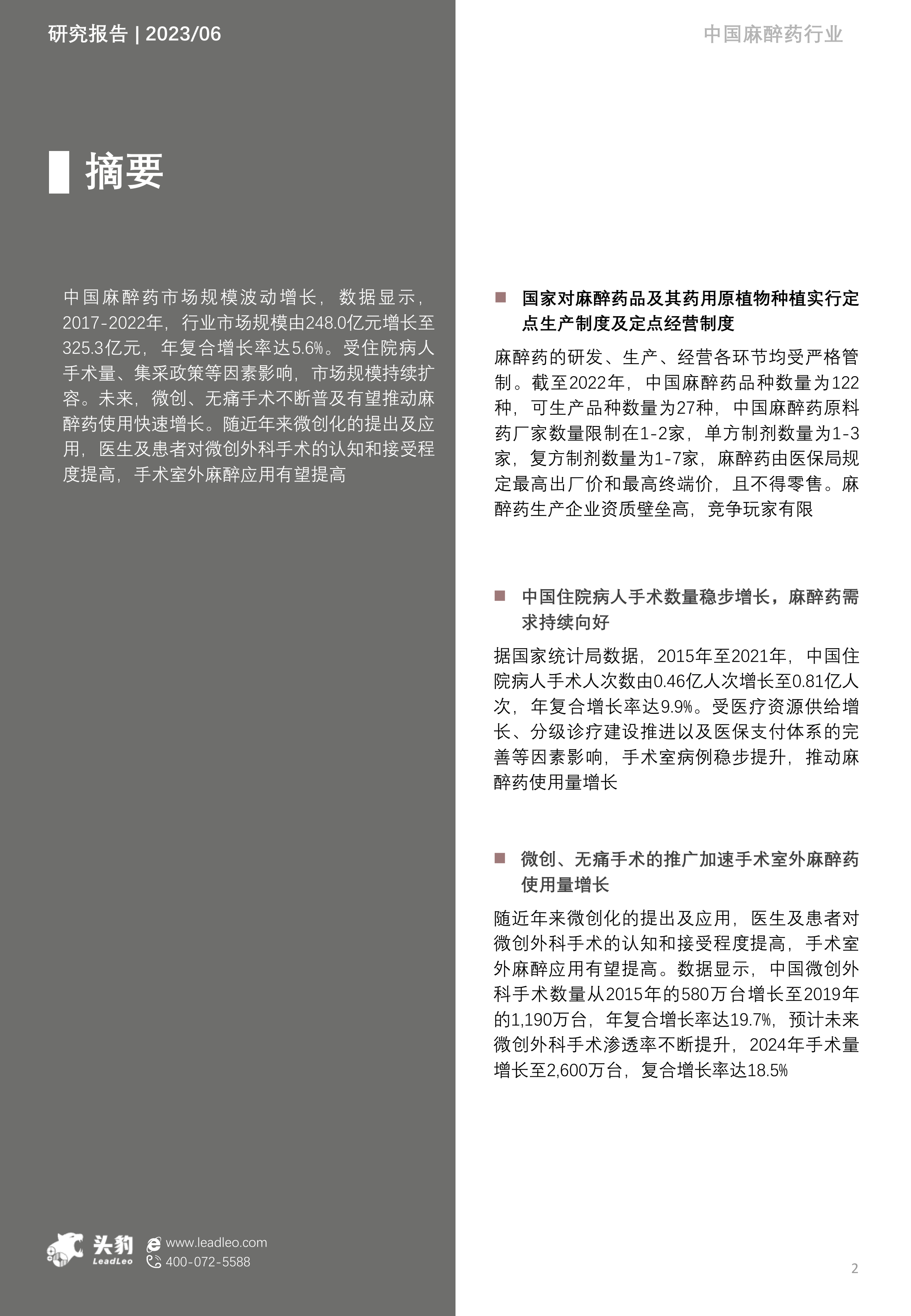 本报告基于头豹研究院对2023年中国麻醉药行业的分析,核心观点如下: