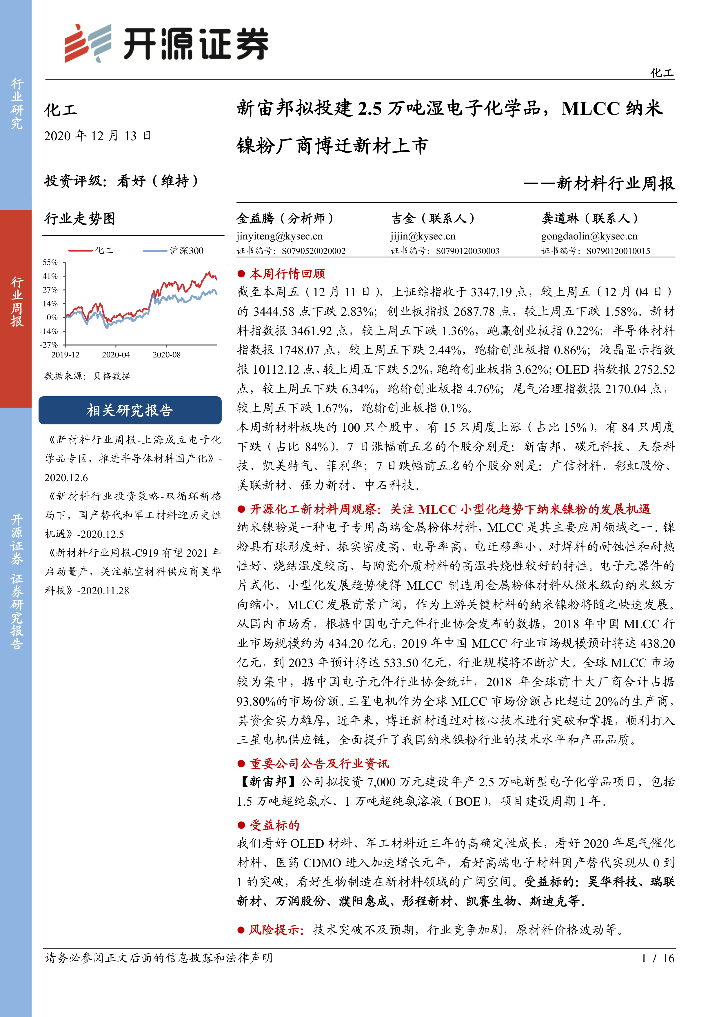新材料行业周报:新宙邦拟投建2.5万吨湿电子化学品,MLCC纳米镍粉厂商博迁新材上市
