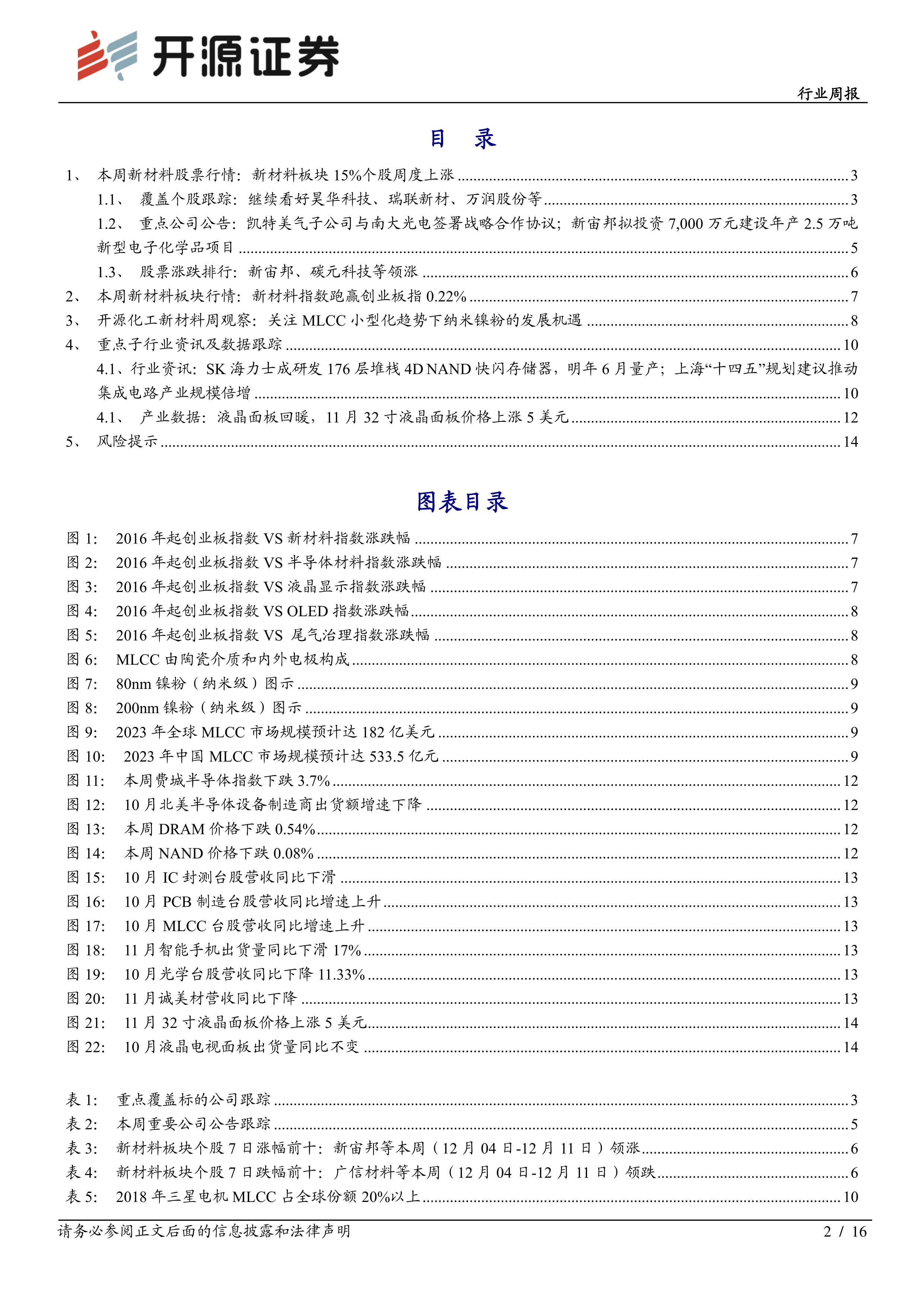 本报告的核心观点是:新材料行业整体表现略逊于创业板指,但部分细分领域展现出增长潜力。具体而言,报告关注了MLCC小型化趋势下纳米镍粉的市场机遇,以及新宙邦等公司在电子化学品领域的投资布局。同时,报告也分析了OLED材料、军工材料、尾气催化材料等细分领域的市场前景及相关上市公司表现。