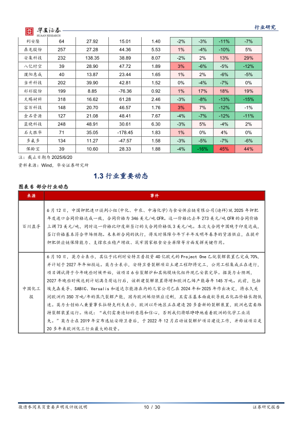 本报告对2025年6月15日至20日一周的化工行业进行了全面回顾和分析。报告指出,本周化工板块整体表现逊色于大盘,但行业内部景气度分化明显。中东地缘冲突等因素导致部分化工产品价格上涨。报告重点关注了合成生物学、制冷剂、电子特气、轻烃化工、COC聚合物、钾肥和MDI等七个高景气赛道,并对相关公司进行了投资建议。 同时,报告也对行业供给侧进行了跟踪,并对石油石化和基础化工重点行业进行了详细的数据分析。 最后,报告列出了潜在的风险因素,为投资者提供参考。 需要注意的是,报告中的信息和意见仅供参考,不构成投资建议。