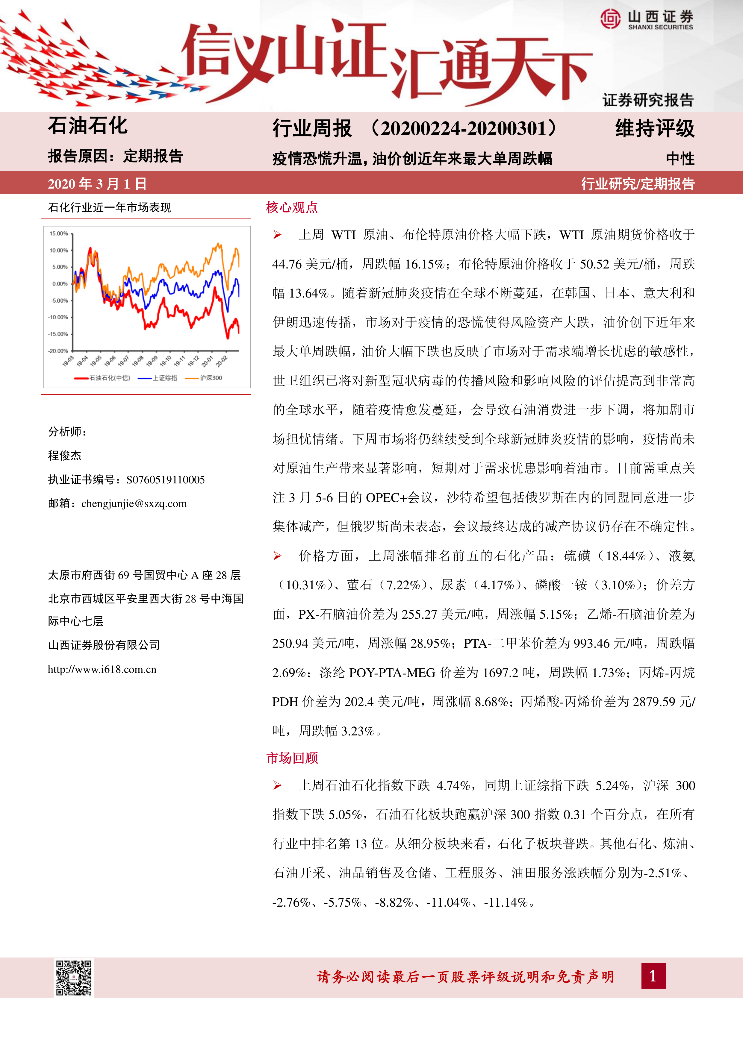 本报告的核心观点是:2020年2月24日至3月1日期间,新冠肺炎疫情的全球蔓延导致油价暴跌,创下近年来最大单周跌幅,市场对石油需求增长忧虑加剧。尽管部分石化企业复工率提升,但疫情冲击仍对行业造成显著影响,下游需求下降成为主要挑战。报告建议关注在疫情期间受益的特定石化企业,例如生产口罩和消毒剂原材料的企业。