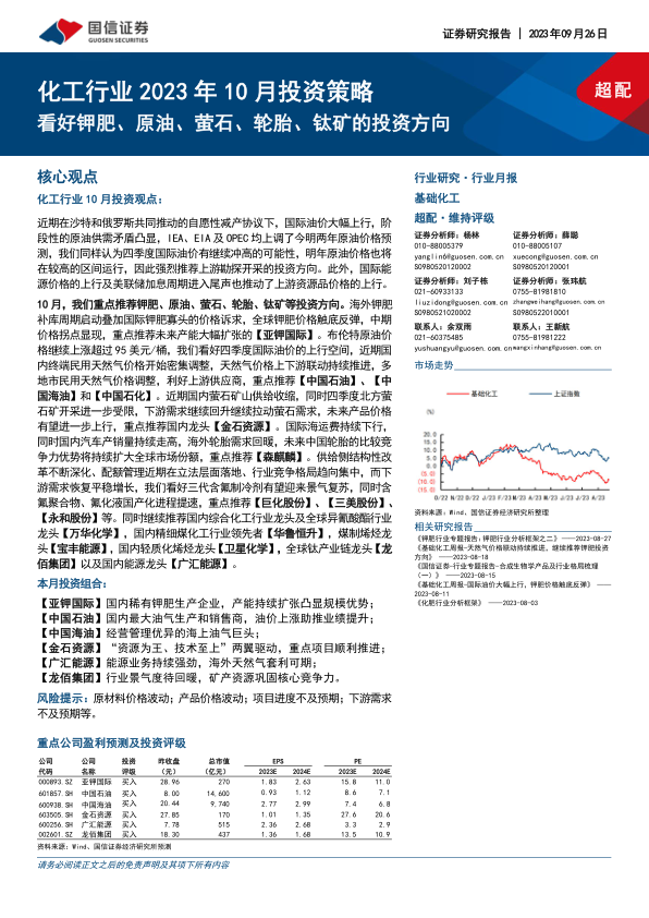 化工行业2023年10月投资策略:看好钾肥、原油、萤石、轮胎、钛矿的投资方向