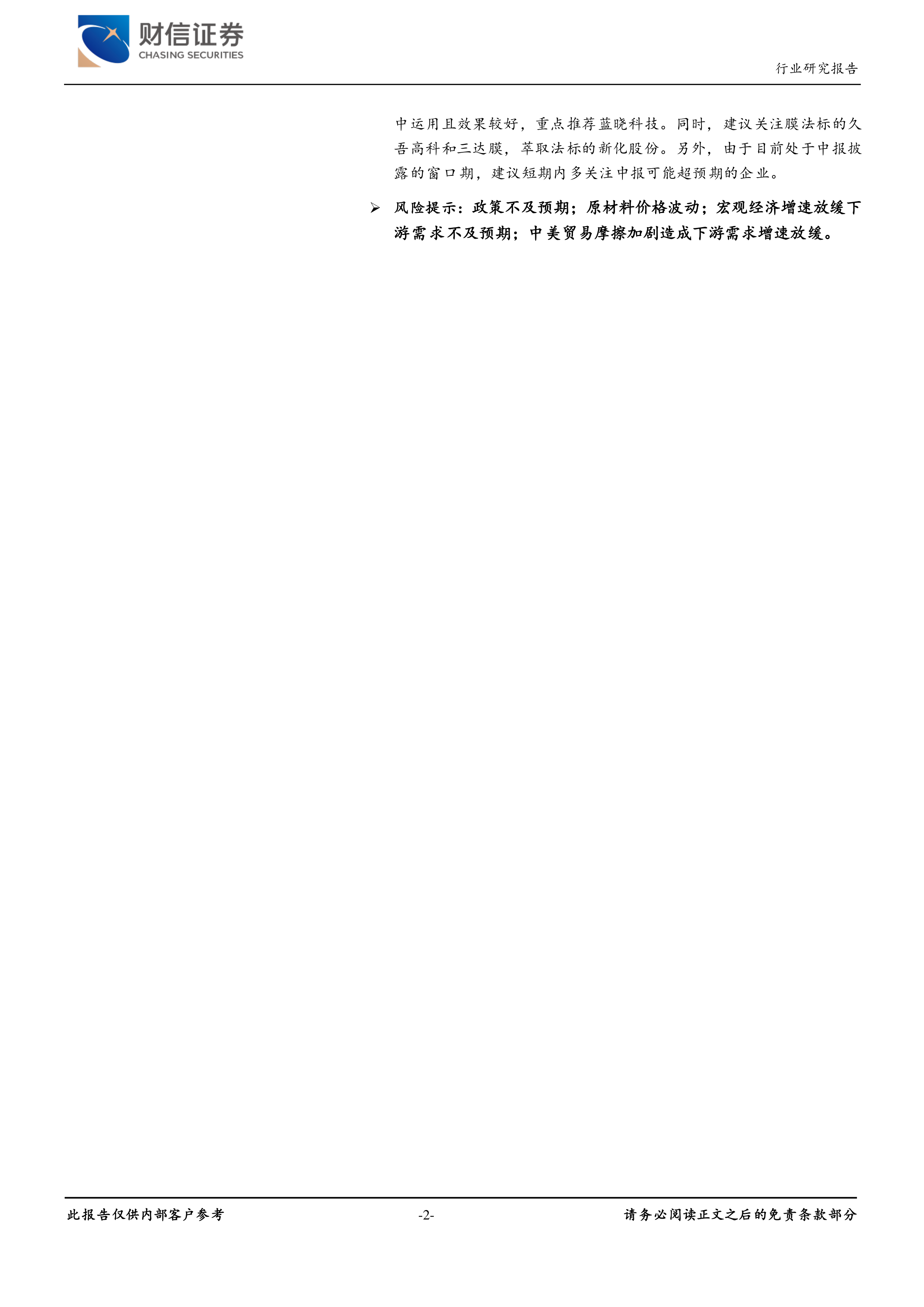 风险提示:政策不及预期;原材料价格波动;宏观经济增速放缓下游需求不及预期;中美贸易摩擦加剧造成下游需求增速放缓。