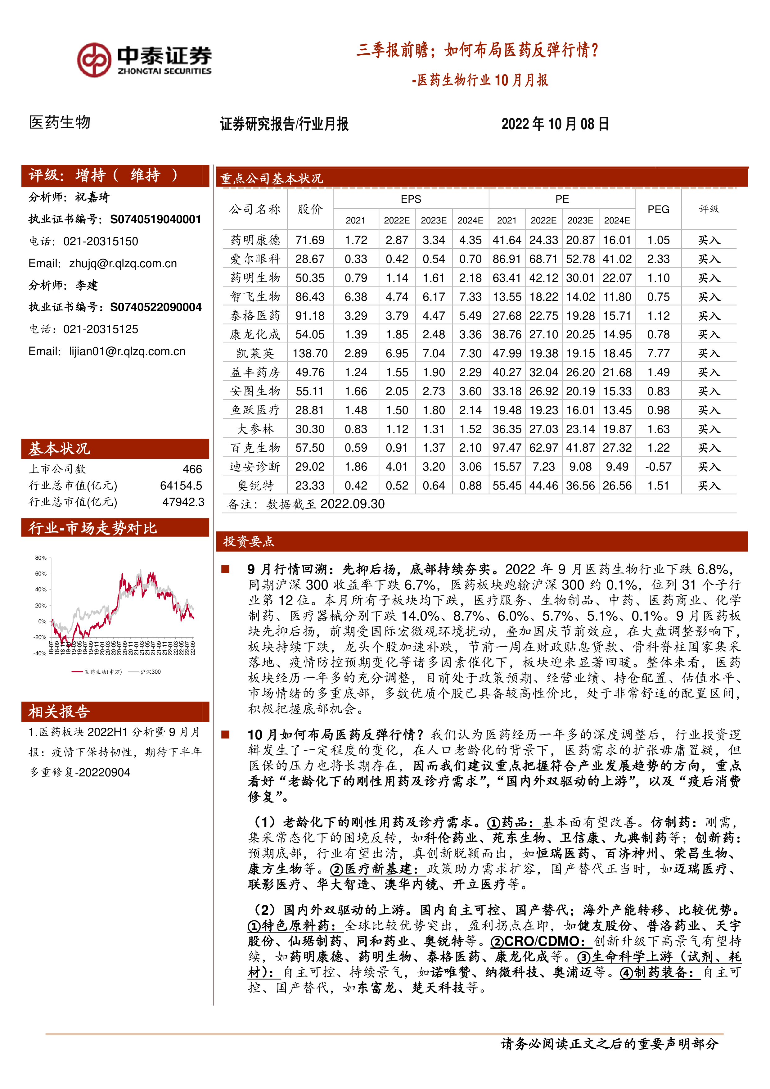 10月重点推荐:药明康德、爱尔眼科、药明生物、智飞生物、泰格医药、康龙化成、凯莱英、益丰药房、安图生物、鱼跃医疗、大参林、百克生物、迪安诊断、奥锐特。