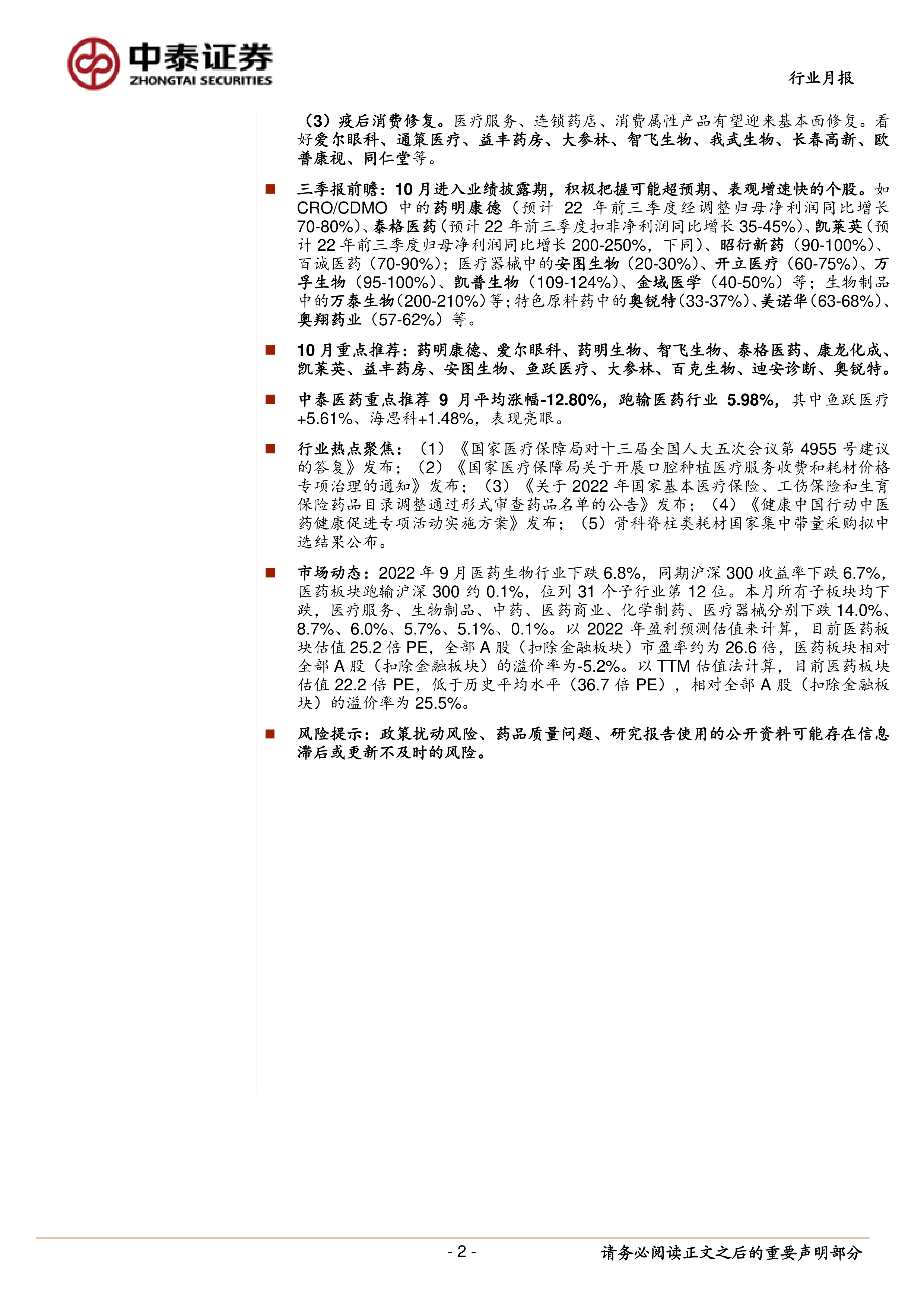 本报告对2022年9月医药板块的市场表现、估值水平以及行业热点事件进行了全面分析,并对部分公司三季报业绩进行了前瞻性预测。报告认为,医药板块已处于多重底部,具备较高的投资价值,建议投资者积极把握底部机会,重点关注“老龄化下的刚性用药及诊疗需求”、“国内外双驱动的上游”以及“疫后消费修复”三个方向,并推荐了14只重点关注股票。 然而,投资者仍需关注政策扰动风险和药品质量风险。 报告中提供的业绩预测和投资建议仅供参考,不构成投资建议,投资者应独立判断并承担相应的投资风险。