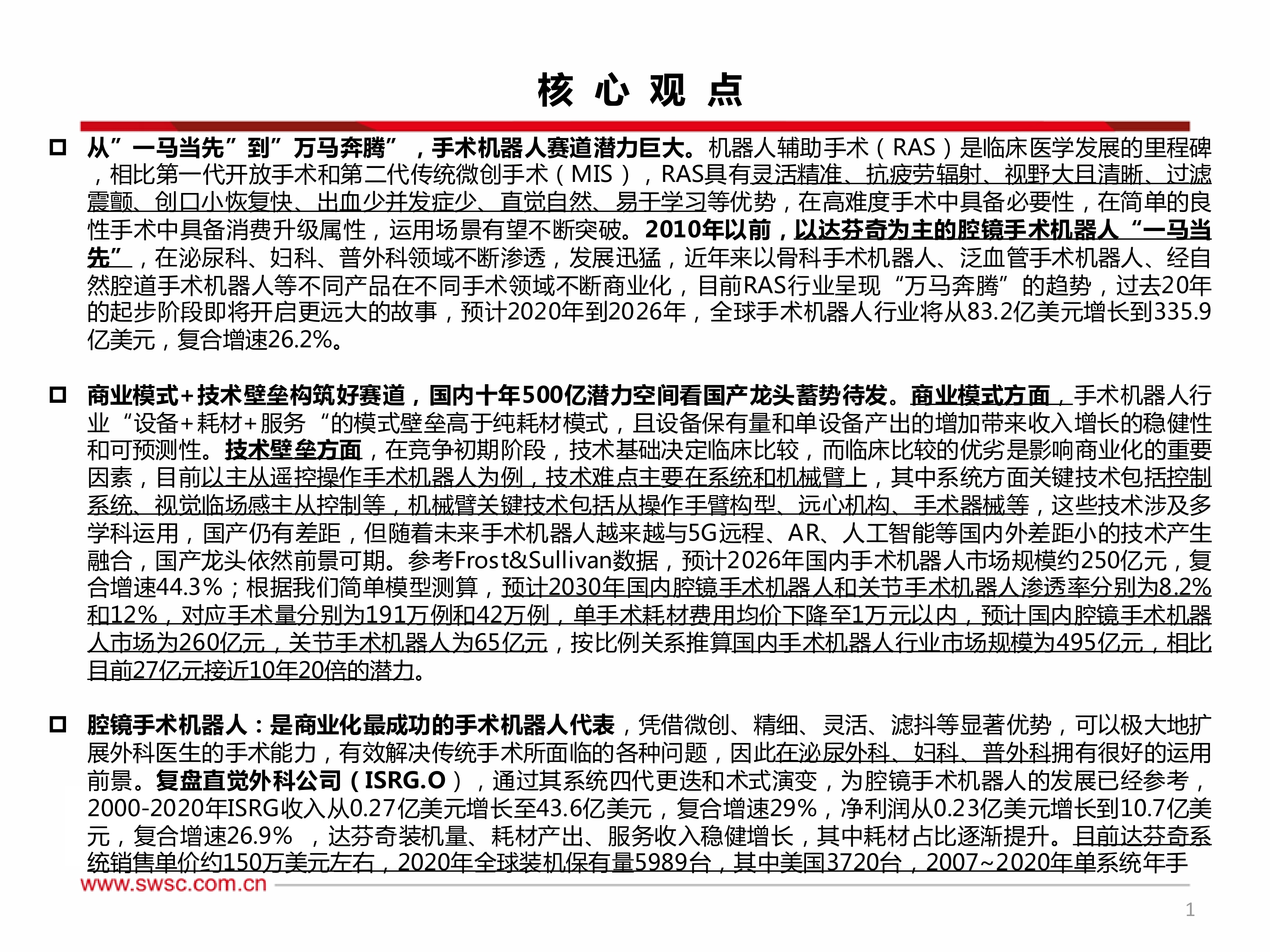 本报告的核心观点是:手术机器人行业正经历从单一巨头主导到百花齐放的转变,市场潜力巨大,预计未来十年国内市场规模将达到500亿元。这一增长潜力源于手术机器人技术本身的优势(精准、微创、高效等),以及“设备+耗材+服务”的商业模式带来的高壁垒。虽然国产手术机器人企业在技术和临床数据方面与国际龙头仍存在差距,但随着5G、AR、人工智能等技术的融合,以及国家政策的支持,国产龙头企业未来前景可期。报告重点分析了腔镜手术机器人、骨科手术机器人以及其他类型手术机器人的市场现状、发展趋势及投资机会。