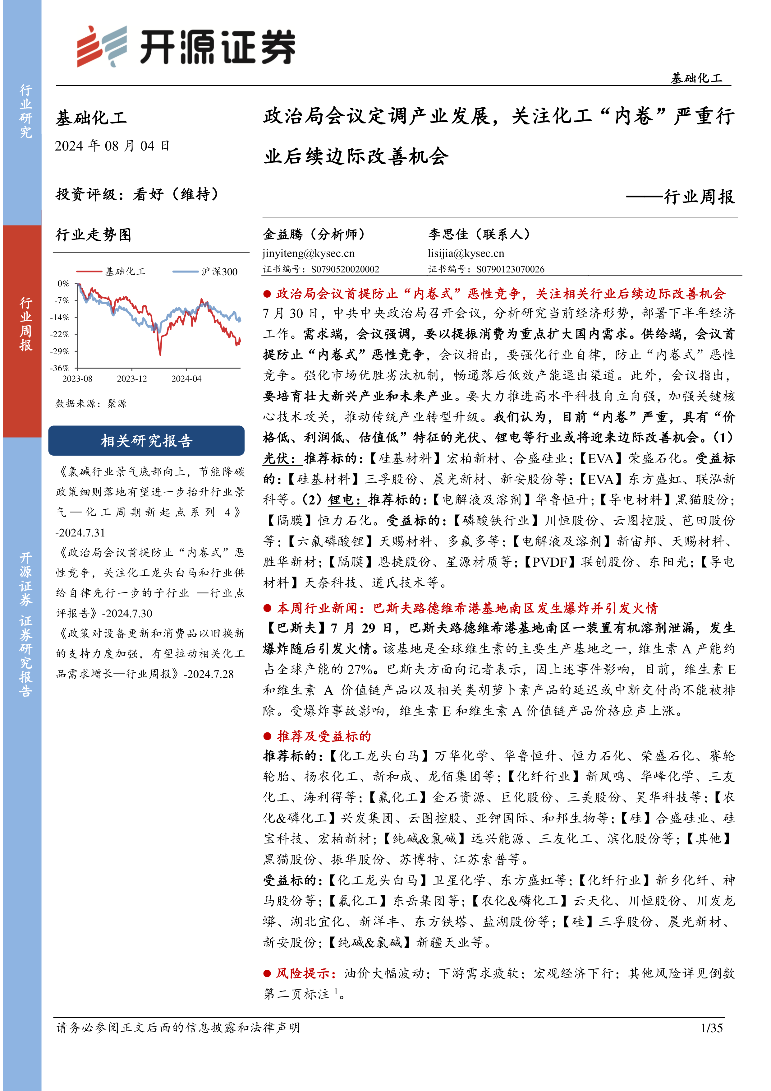 7 月 30 日,中共中央政治局召开会议,分析研究当前经济形势,部署下半年经济工作。 需求端,会议强调,要以提振消费为重点扩大国内需求。供给端,会议首提防止“内卷式”恶性竞争, 会议指出,要强化行业自律,防止“内卷式”恶性竞争。强化市场优胜劣汰机制,畅通落后低效产能退出渠道。 此外, 会议指出,要培育壮大新兴产业和未来产业。要大力推进高水平科技自立自强,加强关键核心技术攻关,推动传统产业转型升级。 我们认为,目前“内卷”严重,具有“价格低、利润低、估值低”特征的光伏、锂电等行业或将迎来边际改善机会。(1)光伏: 推荐标的:【硅基材料】宏柏新材、合盛硅业;【EVA】荣盛石化。 受益标的: 【硅基材料】三孚股份、晨光新材、新安股份等;【EVA】东方盛虹、联泓新科等。(2) 锂电: 推荐标的:【电解液及溶剂】华鲁恒升;【导电材料】黑猫股份;【隔膜】恒力石化。 受益标的: 【磷酸铁行业】川恒股份、云图控股、芭田股份等;【六氟磷酸锂】天赐材料、多氟多等;【电解液及溶剂】新宙邦、天赐材料、胜华新材;【隔膜】恩捷股份、星源材质等;【PVDF】联创股份、东阳光;【导电材料】天奈科技、道氏技术等。