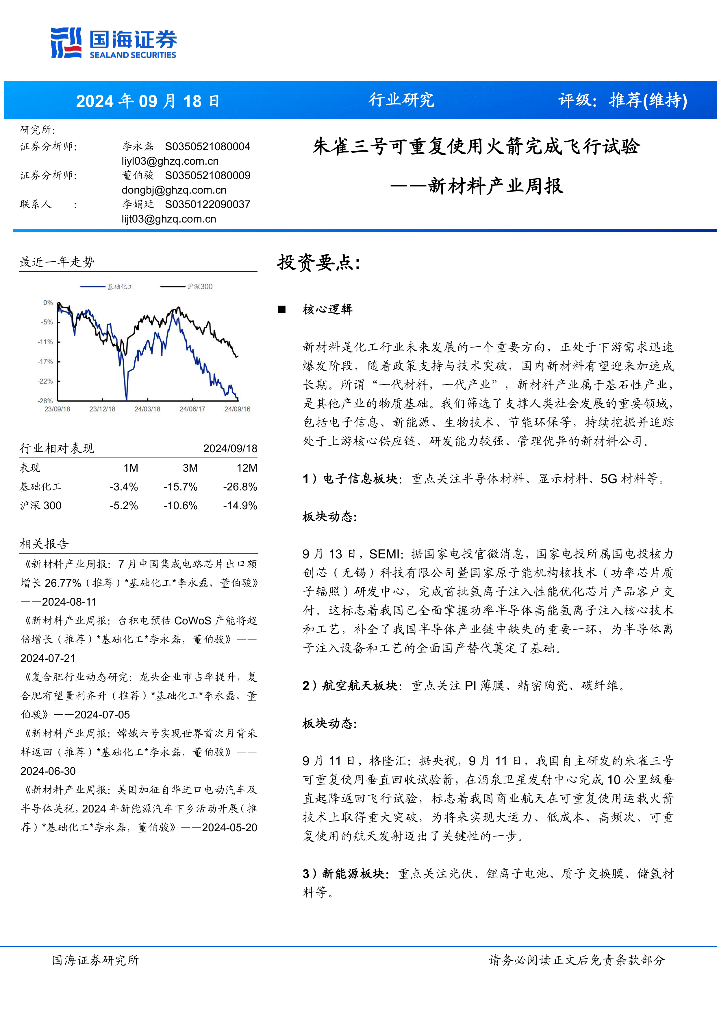 本报告基于公开信息和数据,对2024年9月18日新材料行业进行了全面分析。报告认为新材料行业发展前景向好,维持“推荐”评级,并对重点关注的细分领域和上市公司进行了详细解读,为投资者提供了重要的参考信息。 然而,投资者需注意报告中提到的风险提示,并根据自身情况谨慎决策。