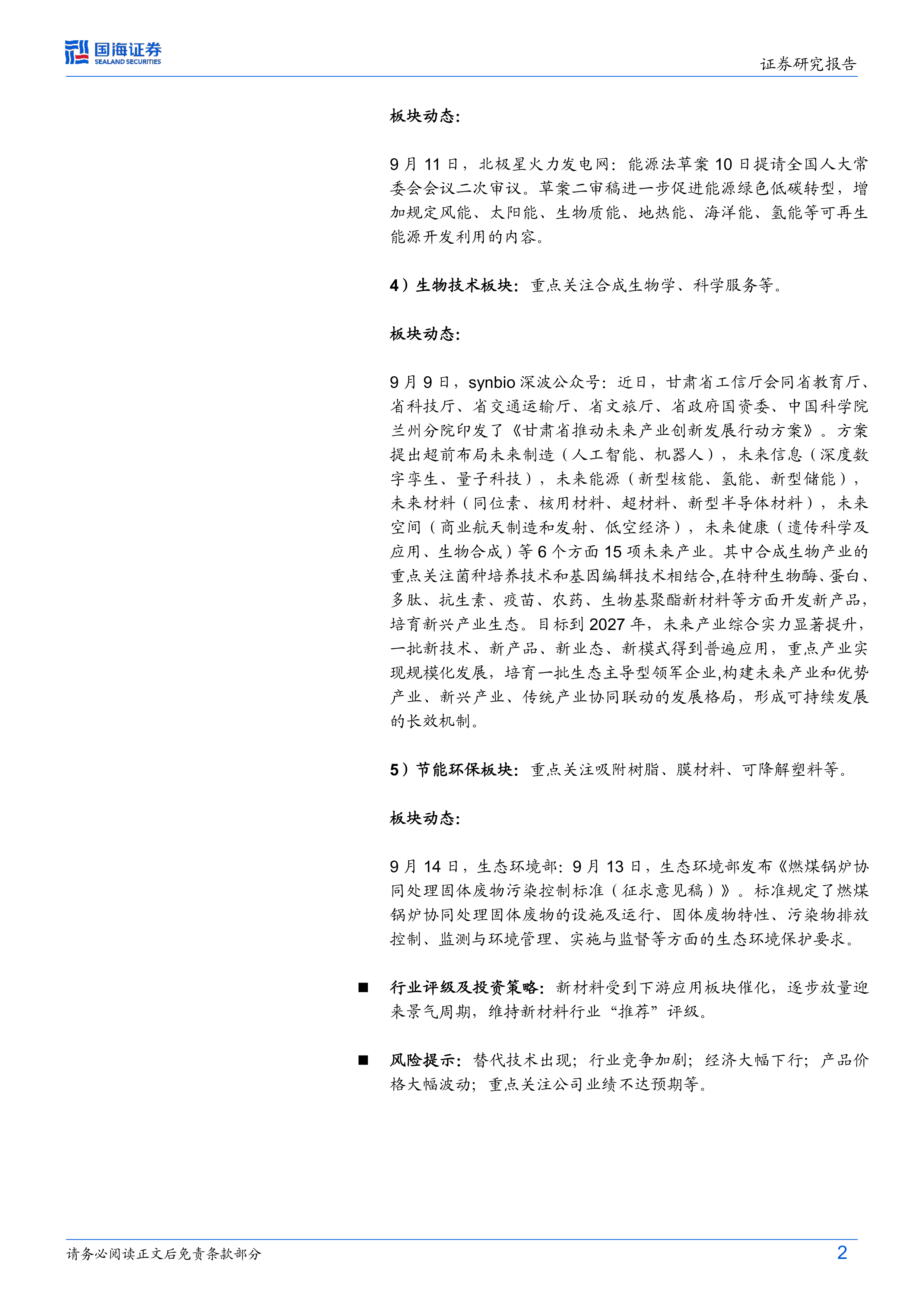 4. 生物技术板块: 报告关注合成生物学和科学服务。 产业动态方面,报告重点介绍了甘肃省推动未来产业创新发展行动方案中关于合成生物产业的规划。 数据方面,报告未提供具体数据。 企业信息部分,报告列出了相关上市公司的公告信息及关键数据。