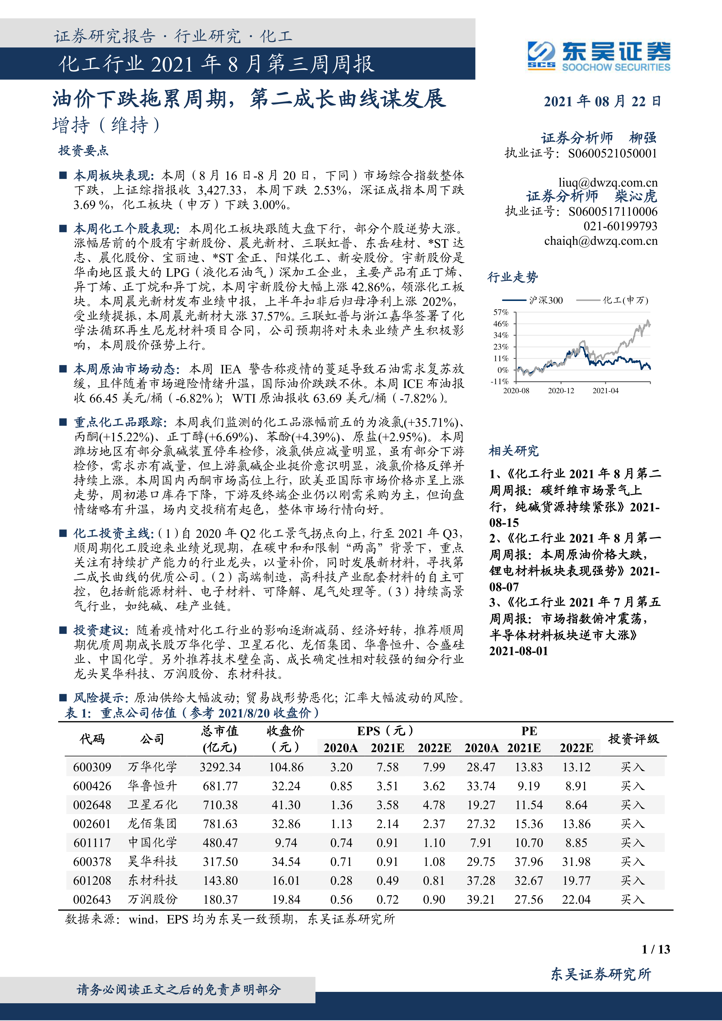 化工行业2021年8月第三周周报:油价下跌拖累周期,第二成长曲线谋发展